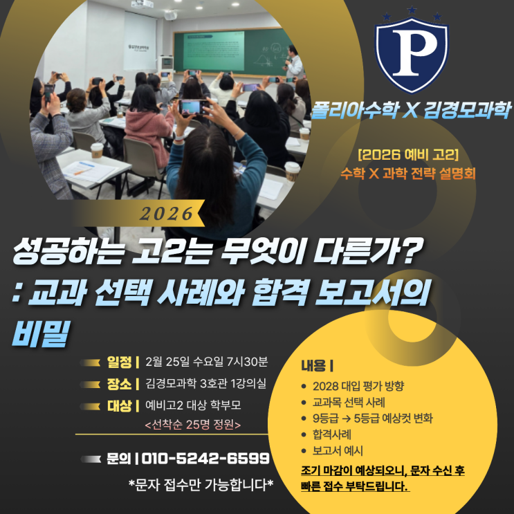 안녕하세요 김경모 과학학원, 폴리아 수학학원입니다. 오늘은 저희 김경모 과학, 폴리아 수학학원에서 준비한 설명회에 대해 안내드리겠습니다:) 지난 1월에는 예비 고1 학부모님들과 함께 입시 전략의 방향을 잡는 시간을 가졌다면, 이번에는 본격적인 입시 레이스에 들어선 고2 학생들을 위한 설명회입니다 :) ✨고2는 ‘아직 2학년’이 아니라 ‘이미 2학년’이라는 말이 있을 만큼 중요한 시기입니다. 또한 、입시는 3학년이 아닌 2학년 때 완성된다는 말이 있을 만큼, 지금의 선택과 관리가 결과로 이어지는 중요한 시기입니다. 이번 설명회에서는 학부모님들께서 가장 궁금해하시는 부분을 중심으로 현실적인 방향을 제시해 드리겠습....... <img src="https://blogthumb.pstatic.net/MjAyNjAyMTlfMzMg/MDAxNzcxNDk2MTUwODY1.6cxGvV-IU3lHSGsgAr2Pqp6yhcMBZV_1WwNZnaPuQCEg.A73a8qIWO0kZDWnRAHS38wLHfT1C0nGV3gn6-YcuRwsg.PNG/20260225_%BC%B3%B8%ED%C8%B8_%C0%DB%BE%F7_%282%29.png?type=s3" />