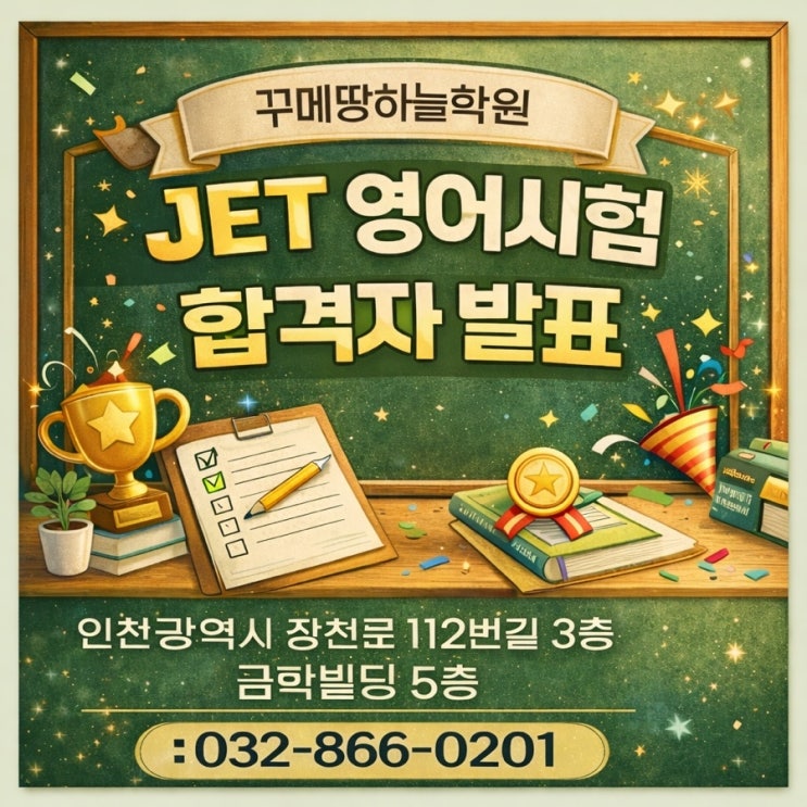 안녕하세요! 인천 미추홀구 숭의동에 위치한 초중등 영어 수학 전문 맞춤형 코칭 전문 학원 꾸메땅하늘학원입니다. 이번에 우리 학원에서 JET(Junior English Test) 영어시험이 시행되었습니다. 아이들이 그동안 갈고닦은 영어 실력을 객관적으로 점검해볼 수 있는 의미 있는 시간이었어요. 꾸메땅하늘학원은 영어 학습을 단순히 문제풀이 중심이 아니라 듣기, 읽기, 이해력을 균형 있게 키우는 방향으로 지도하고 있습니다. 이번 JET 시험은 그 과정을 점검하는 중요한 단계였습니다. ⸻ JET 영어시험이란? JET는 초·중등 학생을 대상으로 한 영어능력평가 시험으로, 듣기와 읽기 영역을 중심으로 구성되어 있습니다. 아이들의 현재 영어 수....... <img src="https://blogthumb.pstatic.net/MjAyNjAyMjdfMjUy/MDAxNzcyMTc4OTc4Mjg2.vgPKy-n9lNoJLQiFDZyJg4fXZRT7g2AlHJVPl9MFxu8g.bTratcvgXl06Z5qT8fg9VOWTxgUDa6Kj5QdRFsW4FTQg.JPEG/5387CE9C%A3%ADC229%A3%AD4E00%A3%AD8AB8%A3%AD15A64503F6ED.jpg?type=s3" />