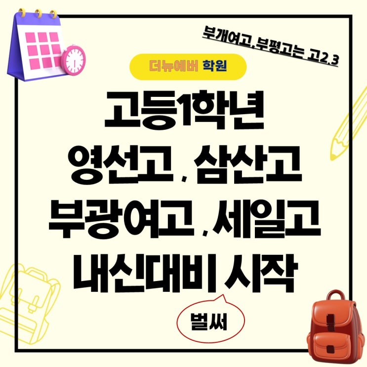 고등부 내신 준비, 중등부처럼 하면 안 되죠 안녕하세요, 삼산동 영어 교육의 중심 더뉴에버 학원입니다. 새 학기의 설렘도 잠시, 이제 고등학생들에게는 '첫 중간고사'가 다가옵니다. 이번 블로그에는 고1 학생들을 위해 고등부 내신 대비에 대해 이야기해 보려 합니다. 고2와 고3은 전략법이 달라지지만 고1이 궁금하실 것 같아서 고1 이야기로 풀어갑니다 (고2,3에는 부개여고와 부평고도 수업합니다.) 더뉴에버의 고등부 내신은 무엇이 다른지 그 7가지 차이를 공개합니다. 1. "왜 이렇게 빨리 시작하나요?" – 4주의 법칙이 깨지는 고등부 중학교 때는 시험 한 달 전(4주)에 시작해도 충분했을지 모릅니다. 하지만 고등....... <img src="https://blogthumb.pstatic.net/MjAyNjAzMDFfMTQ4/MDAxNzcyMzMxMzc0MzM2.dDeFaWzY7z4SG8hcdFQidTDLS3z5IotB5FZIQqU1nIMg.SXaX7S_s1ev2I7Q6AmaY9fcyhz9RnGra90lt0IOobKgg.JPEG/%B3%EB%B6%F5%BB%F6_%C0%CF%B7%AF%BD%BA%C6%AE_%BB%F5%C7%D0%B1%E2_%C7%D2%C0%CE_%C0%CC%BA%A5%C6%AE_%C0%CE%BD%BA%C5%B8%B1%D7%B7%A5_%B0%D4%BD%C3%B9%B0.jpg?type=s3" />