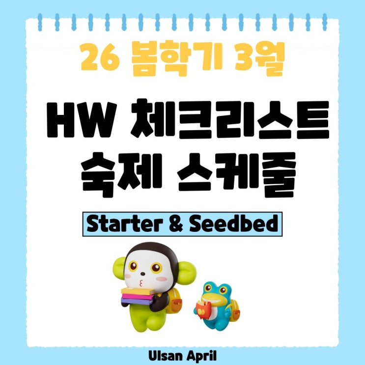 안녕하세요, 울산 청담 April 어학원입니다. Phonics Starter [ 봄학기 Book 1 개강일 ] 월수금 클래스 : 3월 2일 (월) 화목 클래스 : 3월 3일 (화) Seedbed A, B Track [ 봄학기 A1/B1 개강일 ] 월수금 클래스 : 3월 2일 (월) 화목 클래스 : 3월 3일 (화) 매달 마다 제공되는 HW checklist (숙제체크리스트)가 블로그에 파일 형식으로 업로드가 되니 나의 수업 요일 (월수금 또는 화목)과 나의 레벨을 잘 확인하여 링크된 파일을 클릭하여 다운로드 후 출력 부탁드립니다 혹시 체크리스트를 잃어버려도 다시한번 프린트를 언제나 할 수 있으니 일석이조겠죠!? <Phonics Starter 월수금> <Phonics Starter 화목> <Seedbed....... <img src="https://blogthumb.pstatic.net/MjAyNjAyMjdfMjc3/MDAxNzcyMTkzMDIxMzU5.XgV4HT6Kl7vw3LtX5FMCZtT1PJWioaTHTqlK3vaPKC0g.h5Yw5gb0b9H8gtf82lmnE30WaVF1mR5KBg1WXA0quGYg.JPEG/1.jpg?type=s3" />