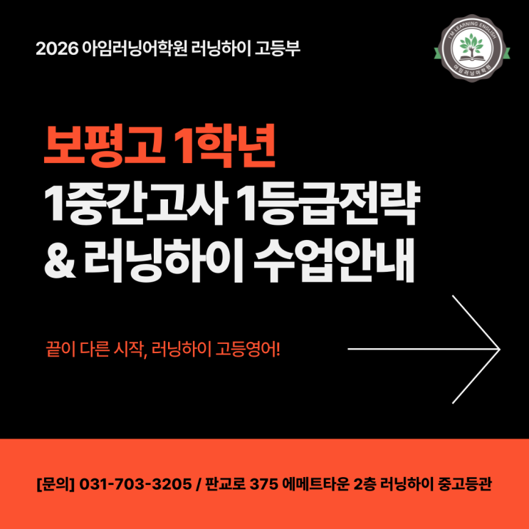 보평고 1학년 영어 1등급, 지금 시작이 다릅니다 2026학년도 1학기 중간고사 완벽대비 | 러닝하이 고등영어 2025년 보평고 1학기 기출, 직접 분석했습니다 안녕하세요? 아임러닝어학원 러닝하이 중고등관입니다. 보평고 1학년 2025년 1학기 1차 지필평가를 분석해보면, 시험의 방향이 명확합니다. 선택형 24문항 — 단순 해석이 아닌 논리적 추론력이 핵심입니다. 빈칸 추론·문장 삽입·글의 흐름·제목/주제 등 고난도 추론형 문항 집중 출제 어법 문항은 문맥 속 어법 판단 — 단순 암기로는 틀리는 구조 (A)~(C) 낱말 선택형은 문맥 독해력 + 어휘력 복합 평가 논술형 3문항, 총 27점 — 단순 요약을 넘어 스타일 분석, 개요작성, 조....... <img src="https://blogthumb.pstatic.net/MjAyNjAyMjhfMjAx/MDAxNzcyMjQ3MDEzNjQ0.JED4CcThnZZqA-luauwCCe_bXSMuZ96ihdrJ__wmYuAg.FKf4kYRvtLC2eluQoinJGNzk_ktTDWd5HCXbd7BA6rAg.PNG/%B7%AF%B4%D7%C7%CF%C0%CC_%BA%ED%B7%CE%B1%D7-003_%283%29.png?type=s3" />