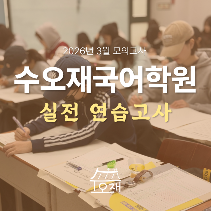 안녕하세요, 부천 수오재 국어학원입니다! 새 학기의 설렘도 잠시, 우리 학생들에게는 올해의 첫 객관적 지표가 될 3월 전국연합학력쳥가가 하루 앞으로 다가왔습니다! 특히 고3 학생들에게는 자신의 위치를 가늠해 볼 수 있는 중요한 시험인 만큼 고3 교실에 긴장감이 높아지고 있어요. 부천 수오재 국어학원에서는 3월 모의고사를 대비하기 위해 지난 주말 학원에서 실전과 동일한 환경으로 모의고사 연습을 진행하였습니다. 시험지 재질과 분위기까지 모두 실전과 똑같아 보이지요? 그냥 문제만 푸는 것보다는 이렇게 실제 시험장의 세세한 요소를 그대로 재현해야 당일날 실수를 더 줄일 수 있을 것 같아서 신경써서 연습 시험을 준비하였답....... <img src="https://blogthumb.pstatic.net/MjAyNjAzMjNfMjM1/MDAxNzc0MjQ0MDI0OTQ0.vPlTvpldDgNJA0Jmk3jFZYrs3yGu-aMUeZ6cUBazRwwg.TJfYkRfPg7MkLnQz6V1IPYes0NuW77tZHPHFRu4TkYUg.PNG/%C1%A6%B8%F1%C0%BB_%C0%D4%B7%C2%C7%D8%C1%D6%BC%BC%BF%E4..png?type=s3" />