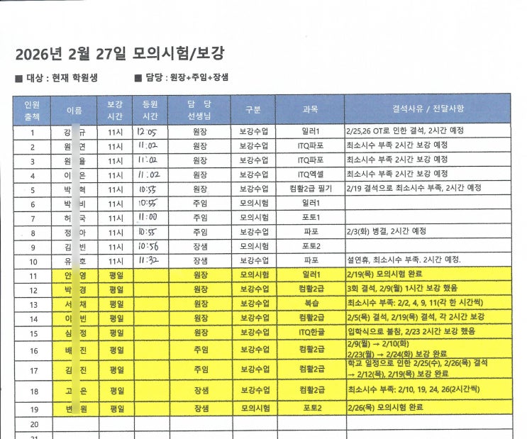 2/27(금) "GTQ 모의시험 및 보강수업" 결과 보고 안녕하세요~ 한국사회컴퓨터학원입니다. 저희 학원은 매월 둘째, 넷째 금요일 "모의시험 및 보강수업"을 진행하고 있습니다. 1. 모의시험 시험 전날, 시험장과 같은 분위기로 모의시험을 실시하여 학원생들이 시험 당일에는 긴장하지 않고 학원에서 연습한대로 편하게 응시할 수 있도록 하고 있습니다. 2. 보강수업 공휴일, 연휴, 학원휴가 등의 이유로 수강기간까지 최소 수업시간(16시간)이 안되는 경우 보강수업을 진행하고 있습니다. 개인 사정에 의한 결석은 해당되지 않습니다. 3. 모의시험 및 보강수업 시간에 대한 공지 https://blog.naver.com/handamen/22402146927....... <img src="https://blogthumb.pstatic.net/MjAyNjAyMjdfNjEg/MDAxNzcyMTYzNDUyOTcx.APXv0lIJRYsZvN5u3qtEazv3kP3NAU_eWpyE4nhnAwog.5MtqmyhLr2Gb3g_VYdf1Ws1-tCPFHNYmggQmrGckcf8g.JPEG/KakaoTalk_20260227_122041441.jpg?type=s3" />