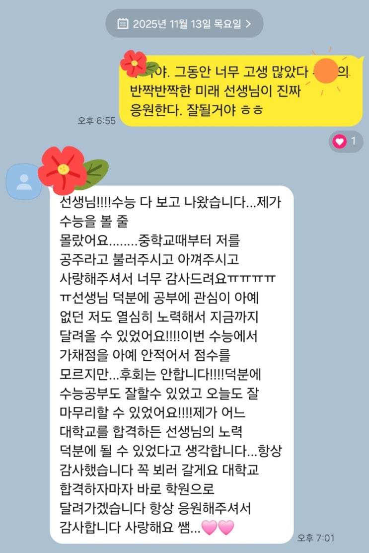 교대에 진학해서 선생님이 되고자 하는 꿈을 가진, 제가 정말 예뻐하는 고3 아이가 수능을 마친 후 보낸 장문의 카톡에 우리 아이들에게 늘 바른 강사의 모습으로 가르치겠노라 다시금 다짐합니다!! 성인이 되고 각자 바빠져도 이따금 연락해주고, 커피 사들고 학원에 찾아오고, 군대 휴가 나와서도 잊지 않고 들러주는 보석 같은 제자들 덕분에 늘 에너지가 넘쳐납니다! 귀하고 소중한 우리 아이들의 꿈에 도움이 되는 어른이고 싶습니다. 열심히 묵묵히 버텨주는 친구들과 믿어주시는 부모님, 항상 감사합니다.♡ <img src="https://blogthumb.pstatic.net/MjAyNTExMTNfMTAy/MDAxNzYzMDQwMTIyNzA5.rIYGpEc9e-E8qWyl0REyiVOOn2hi8e5f7vclFmssmMAg.Q0KASkmhItRSFga2b7pG1xKMnqypmvNgSXPeR_ZfIGMg.JPEG/900%A3%DFScreenshot%A3%DF20251113%A3%DF202213%A3%DFKakaoTalk.jpg?type=s3" />