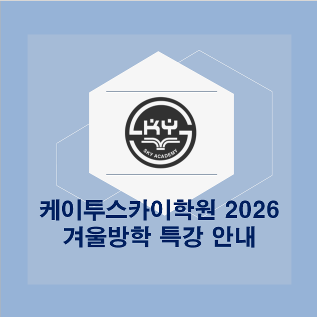 케이투스카이학원 케이투스카이학원 2026 겨울방학 특강 안내 안녕하세요! 케이투스카이학원에서 겨울방학 특강 수강생을 모집합니다. 겨울방학은 학기 중에 부족했던 부분을 정리하고 다음 학기를 준비할 수 있는 가장 안정적인 기간입니다. 비교적 시간이 여유로운 만큼, 새로운 개념을 미리 익히거나 취약한 과목을 보완할 최적의 환경이 만들어집니다. 또한 이 시기에 만들어진 학습 흐름은 개학 후 성적과 학습 자신감으로 이어지는 중요한 기반이 됩니다. 이번 특강을 통해 각자의 실력을 한층 더 업그레이드 할 수 있는 방학이 되기를 바랍니다. 많은 관심 부탁드립니다! 접수 기간 2025년 12월 1일 ~ 강좌별 마감 시까지 특강 기간 초등....... <img src="https://blogthumb.pstatic.net/MjAyNTEyMDlfODEg/MDAxNzY1Mjc4NjA2Mzk5.GnMCffoZ5Qeiuov4D6ocv9cY_V3T0_IoeDbp53nbQwUg.GtHA-aGjXSfiROFlQsvi63a5mztrLCkHVQ5s5I_Sx1Mg.PNG/image.png?type=s3" />