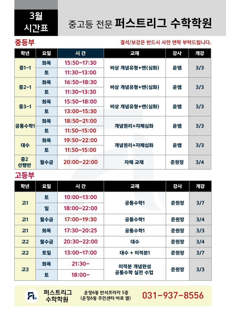 [퍼스트리그 수학학원] 2026학년도 1학기 중고등 수학 정규반 시간표 안내