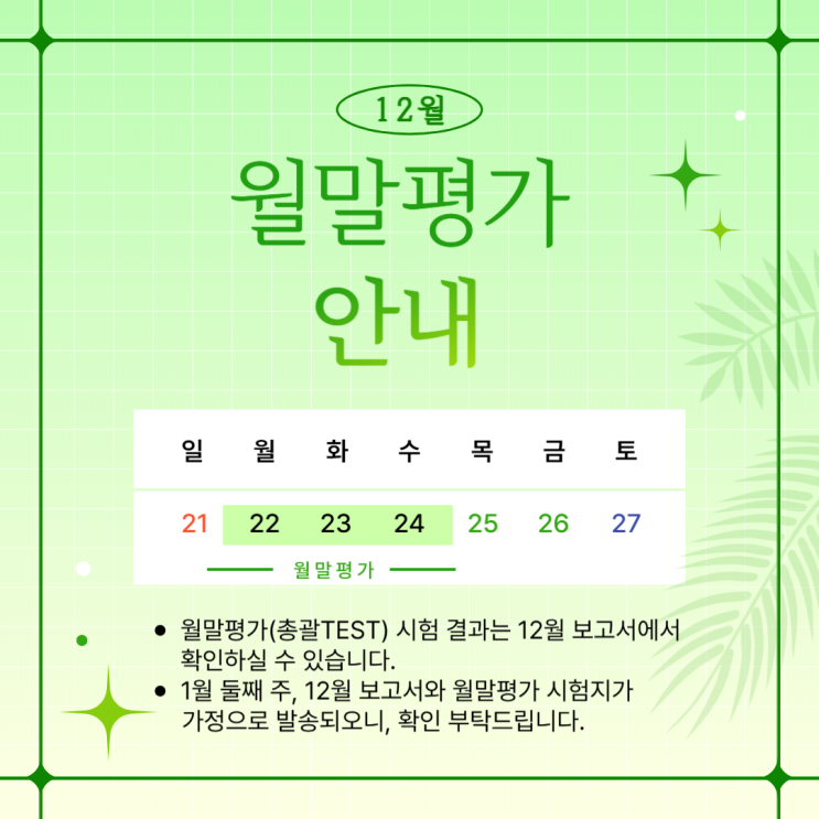 안녕하세요 여러분! 행당동 행당역 한진타운상가 지니플러스 영수학원 원장 김혜진입니다. 저희 학원에서는 짝수달 마다 월말평가를 진행하고 있습니다. 월말평가는 단원마다 진행하는 단원평가와는 달리 학생 본인 진도와는 상관없이 현행 진도의 수준을 평가하는 테스트입니다. 선행을 아무리 빠르게 하고 있는 학생이라도 지금 학교에서 진행하는 현행부분도 놓쳐서는 안되겠죠? 학생들이 얼마나 잘 따라가고 있는 지 늘 궁금하신 어머님들께도 우리아이의 현재 현행진도에서의 실력을 한눈에 점검해보실 수 있는 점검도구입니다. 아이들별로 상,중,하로 나누어 시험을 진행합니다. 이번 12월에도 곧 월말평가가 진행되어, 안내 드립니다. * 평....... <img src="https://blogthumb.pstatic.net/MjAyNTEyMTBfNCAg/MDAxNzY1MzU5MjMzOTM2.374_f93bLizwdrKyHpMcyWdIn6nS1vJ8GlIVxIov6hgg.TZi9ivGRhozhj72JYmSbryatJOyUDTyvY9TX0JodFsAg.PNG/12%BF%F9_%BF%F9%B8%BB%B0%ED%BB%E7.png?type=s3" />