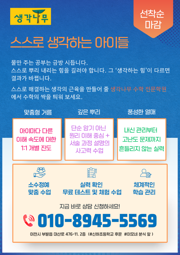 생각하며 수학문제를 해결하고 서술하며 문제해결하는 신하초 후문 생각나무 학원 새학기에 수학과 친해질수 있는 친구들을 기다립니다. 초등과정 주4회 (정규수업 ) 주1회 ( 테스트 및 보충수업) 1일 60문 수업으로 개념으로 기초 튼튼히 잡고 결손 보충으로 줄기를 죽죽 뻣어 나가는 진짜 실력을 키웁니다. 개별 관리를 통해 아이들의 결손과 진도를 잘 의논하여 진행합니다. 일주일 체험수업동안 테스트 결과를 분석해 드립니다^^ 전문가의 분석으로 우리 아이 학습 진단을 받아 보셔요. 10년이상 부모님들의 입소문으로 서술형에 강한 아이들로 성장 시켜 온 학원. 고등 서술형을 지금부터 준비해야 아이들 학습 부담을 줄이게 됩니다. 초등....... <img src="https://blogthumb.pstatic.net/MjAyNjAyMjdfMjUx/MDAxNzcyMTkwNDc4NzMw.E0noLEzlU0GBUjBUSH_pgg-Ni-jSPzeoAwHkuGua5gQg.8ER6PcMRzOEVbzVxSHqkUWq1nkFjwCYVHsXVTGvt6QYg.PNG/900%A3%DF1772095018363.png?type=s3" />
