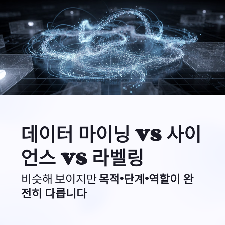 데이터 마이닝·데이터 사이언스·데이터 라벨링 뜻 차이점 정리 안녕하세요. 요즘 IT 뉴스나 취업 공고를 보면 데이터 마이닝, 데이터 사이언스, 데이터 라벨링이라는 단어가 자주 등장합니다. 비슷해 보이지만, 실제로는 목적·단계·역할이 완전히 다릅니다. 오늘은 이 세 가지 개념을 헷갈리지 않게, 한 번에 정리해보겠습니다. 1️⃣ 데이터 마이닝 뜻 – “패턴을 찾아내는 기술” 데이터 마이닝(Data Mining)은 대량의 데이터 속에서 의미 있는 패턴이나 규칙을 찾아내는 기술입니다. 예를 들어, 마트 고객 데이터 분석 카드 사용 내역 분석 이상 거래 탐지 처럼 “숨어 있는 규칙”을 자동으로 발견하는 작업입니다. 대표적인 예로는 “기저....... <img src="https://blogthumb.pstatic.net/MjAyNjAzMDFfMjcz/MDAxNzcyMzAxNTIwNjUy.udMwPKvEZeJKzOT5kHlPjSQg2mMq-5x_9L-cOKQlCQog.voJDsOuPWiGybfUkam7sacOTh0VtQFhtMG7gGZQsSTAg.PNG/1_vs-vs.png?type=s3" />