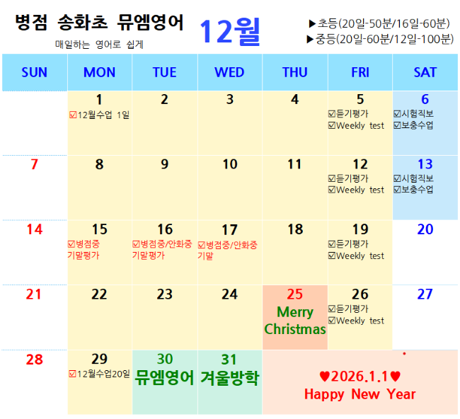 [병점 송화초 뮤엠영어 12월 수업 안내] 매일 영어, 쉽게! 과제는 꾸준히! 중등부 2학기 내신까지 확실하게 대비하고, 겨울방학에는 2026년을 위한 탄탄한 준비를 시작합니다. 12월 수업 일정 12/1 ~12/29 (총 20회 수업) ■ 중등시험 보충: 12/6, 12/13 오전 9시 ~ 11시 ■ 뮤엠영어 겨울방학: 12/30~12/31 수업 시간 (개별 학습 • 시간 엄수) 초등부 ▪︎오후 1:30 ~ 5:30 ▪︎50분 × 20회, 60분 × 16회, 80분 × 12회 중등부 ▪︎오후 5:00 ~ 7:30 ▪︎60분 ×20회 , 100분 × 12회, 120분 × 10회 ■예비중 수업중인 학생만 중등부시간 등원 가능합니다. 결석 및 보충규정 ▪︎당일 결석 및 무단결석은 보충 불가 ▪︎전날까지 결....... <img src="https://blogthumb.pstatic.net/MjAyNTEyMDFfMjQz/MDAxNzY0NTQzMjUxODM1.lAMDoyHRselhGrx_ozGer3tAnfuWHv80HuUKiSEQ7Rkg.9KvHGod-CqSVIObwhPWx5aEvme8zUbEf7g443kSydKYg.PNG/650%A3%DF1764324609069.png?type=s3" />
