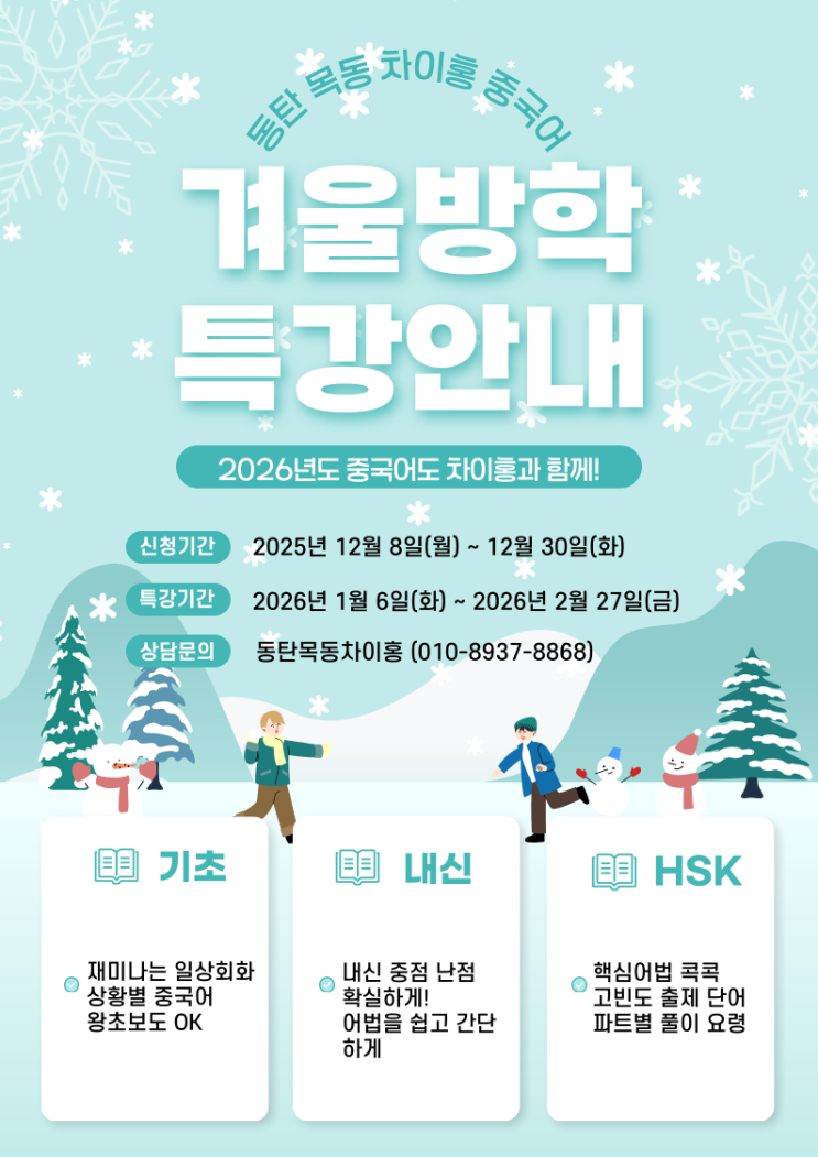 안녕하세요^^ 동탄 목동 차이홍 중국어 교습소 입니다. 올해도 어느덧 한 해가 마무리되고, 곧 겨울방학이 다가오고 있네요~~ 이번 겨울방학 동안 저희 동탄 목동 차이홍 교습소에서는 ⬇️ 아래 프로그램으로 겨울방학 특강반을 운영합니다. 겨울방학 특강 프로그램 안내 ✔️ 기초반 • 처음 중국어를 배우시려는 분 • 발음(성조,병음), 기초회화, 자기소개 등 • 중국어를 빠르게 배워야 하시는 분들 강력 추천 ✔️ 내신반 • 중고등 내신 대비 • 교과서 표현 핵심 정리 • 시간 없고 내신 중요한 친구들 강력 추천 ✔️HSK반 • HSK1부터 수준별 맞춤 학습 • 자주 출제되는 핵심 문법 콕콕 • 단기간 성적 향상을 목표인 분들 강력....... <img src="https://blogthumb.pstatic.net/MjAyNTEyMDRfMjE3/MDAxNzY0ODMyMTU0MDY4.EwSLNqHR5Tar0n6X8wJQJN52btWP1XLyBDRqCTPAtlAg.imFof0pr1DwQ3Vf6wLmhO0YCO_OiQdMPD5NElXbUR_Yg.PNG/IMG%A3%DF0891.PNG?type=s3" />