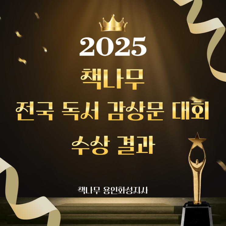 안녕하세요, 책나무 용인·화성지사입니다. 오늘은 두 가지 기쁜 소식을 함께 전해드리려고 합니다. ✔ 2025년 전국 독서 감상문 대회 수상자 발표 ✔ 2025년 책나무 우수지점 선정 소식 우리 지역의 많은 학생들과 지점들이 뛰어난 실력과 노력을 인정받았습니다. 진심으로 축하드립니다! 1. 2025 책나무 전국 독서 감상문 대회 올해도 용인·화성 지역에서는 정말 많은 학생들이 본선 심사에서 우수한 성적을 거두었습니다. 독서를 꾸준히 이어가며 생각을 키우고, 그 마음을 글로 담아낸 모든 학생들이 참 자랑스럽습니다. 지점별로 균형 있게 수상자가 나왔고, 특히 표현력, 논리력, 문해력의 성장이 돋보인 작품들이 많았습니다....... <img src="https://blogthumb.pstatic.net/MjAyNTEyMDVfMTM5/MDAxNzY0OTI1MDIzMDAz.4ogfG4FYRZp4ZMAdI0WCdOGNmD8ZokjJ4BYlJklemKAg.erE70qKvM8QYBU9Gar2JDbi35XPvRZmuB5vTV98flCwg.PNG/%BA%ED%B7%CE%B1%D7_%C7%A5%C1%F6.png?type=s3" />