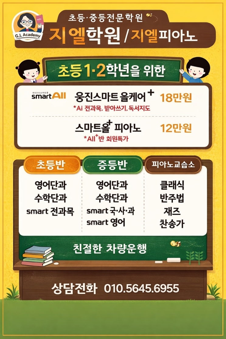 지엘학원 스마트올 수업으로 시작하세요! 안녕하세요 초등·중등 전문 지엘학원입니다. 2026년, 우리 아이의 첫 초등학교 생활! 설렘도 크지만, 걱정도 함께 따라오시죠? ✔ 학교 수업 잘 따라갈 수 있을까? ✔ 받아쓰기, 독서 습관은 언제부터 잡아야 할까? ✔ 공부를 ‘싫어하는 아이’가 되면 어떡하지? 지엘학원은 초등 1학년을 위한 맞춤 스마트올 수업으로 아이의 첫 공부 습관을 제대로 잡아드립니다. ⸻ 초등 1학년, 왜 준비가 중요할까요? 1학년은 단순히 “쉬운 학년”이 아닙니다. 이 시기에 형성된 공부 습관이 6학년까지 이어집니다. 특히, • ✏ 받아쓰기 기초 • 독서 습관 • ➕ 수학 연산 기초 • 자기주도....... <img src="https://blogthumb.pstatic.net/MjAyNjAzMDJfNjMg/MDAxNzcyNDMyNzc1MDI5.06GQit0gH5AMGNpQokGk1riaePiqlYd0aRuPC66PfW4g.21gxghQ8GxZc0itCqsDtURXTrfABOfQ7IMJL1CYgROMg.JPEG/35E8A654%A3%AD25FD%A3%AD4F5D%A3%AD92E6%A3%ADF323E913A559.jpg?type=s3" />