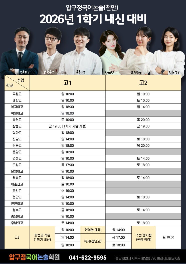 천안 압구정 국어논술학원입니다. 긴 겨울 방학이 끝나고 이제는 천안압구정 국어논술 재원생 여러분들의 노력의 결실을 향해 한 발짝 더 나아가야 할 시기가 찾아왔습니다. 천안압구정국어논술에서는 내실 있는 강의, 학교별 전담 강사, 자체제작 교재 뿐만 아니라 재원생 여러분들의 꿈과 목표를 위해 최선을 다하여 노력하는 강사진이 함께합니다. 1. 내신 대비 개강일 3월 14일 토요일 2-교재: -자체 제작 교재 -내신 대비 수업은 보강이 어렵습니다. 꼭 첫 수업부터 등원해 주시길 바랍니다. -내신 대비 수업은 직전대비까지 포함하여 이루어지며, 학교별 시험 날짜에 따라 수업 회차가 추가될 수 있습니다. -학교별 세부 내용은 담당 선생....... <img src="https://blogthumb.pstatic.net/MjAyNjAyMjdfMTU1/MDAxNzcyMTkxMTAwOTg3.undDuHTFBuSRYdI3eeRcmMjm_3CN8PCt-Vyx5vOwaPYg.pLoUpWfBQf1JH4cp6g14ESmteFBrDlUD3Zdw34xRl_kg.JPEG/2026_1%C7%D0%B1%E2_%C1%DF%B0%A3.jpg?type=s3" />