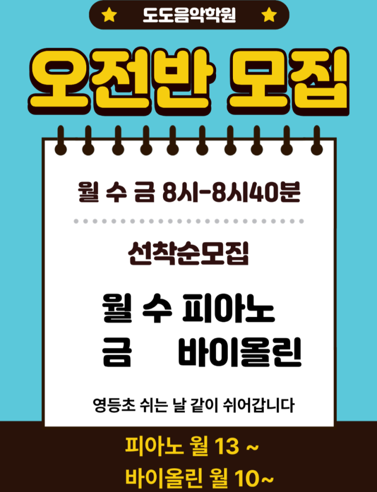 피아노는 배우고 싶은데 오후 시간이 안 되는 친구들을 위해 오전반을 개설했습니다 월수 8시-8시40분 피아노 수업 금요일 8시-8시40분 바이올린 수업 진행합니다♡ 문의전화 010 3135 9698 <img src="https://blogthumb.pstatic.net/MjAyNjAyMjdfODUg/MDAxNzcyMTg0MzQ5Mzc0.3bZOtQdteJM0sBGpNbKbY5p6TYjlfqFz4HvQNeszYXcg.rOWdfeCFjLZDWT2IWmnZA5gBfyO8ASdI8dpEp1cvkucg.PNG/900%A3%DF%C1%A6%B8%F1%C0%BB_%C0%D4%B7%C2%C7%D8%C1%D6%BC%BC%BF%E4..png?type=s3" />