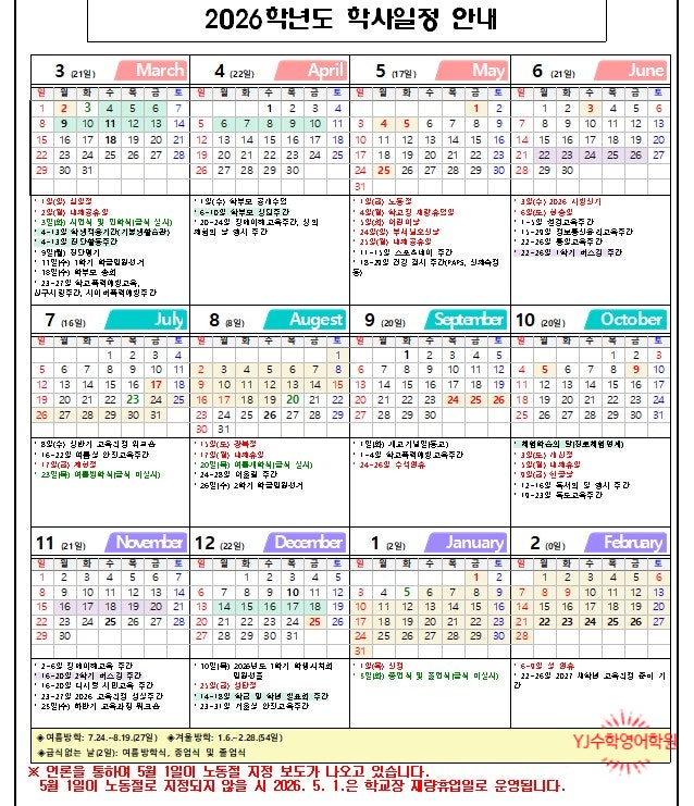 2026학년도 3월 제이엠영어학원 주요 일정