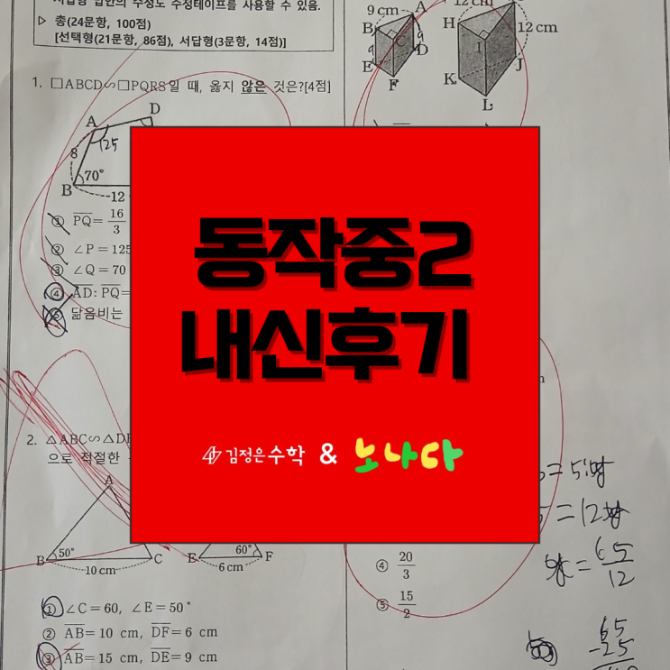 안녕하세요 김정은수학&노나다 입니다 ^^ 오늘의 내신분석글은 이번 월요일에 치뤄졌던 동작중2 기말고사에 대해 포스팅하였습니다 내신대비를 하느라 정말 바쁘신 와중에도 이렇게 내신후기글을 작성해주신 저희 선생님께 정말 감사하다는 말 꼭 남기고 싶었습니다!! 시험을 본 학생들 또한 정말 고생 많았다는 말 꼭 해주고 싶고, 겨울방학 알차게 보내서 내년에는 더 좋은 결과 낼 수 있도록 항상 최선을 다하는 김정은수학&노나다가 되겠습니다! 이 글을 읽으시는 학부모님 혹은 학생들에게 많은 도움 되었으면 좋겠습니다 ㅎㅎ 2025 동작중2 2학기 기말고사 내신후기 이번 동작중2 2학기 기말고사는 "도형의닮음"부터 &qu....... <img src="https://blogthumb.pstatic.net/MjAyNTEyMTBfMTI0/MDAxNzY1MzYyMDgxODc3.NRGSW4wDWRFuX_MiuLchl6__D3IJ0LMu7XpO8G75mSsg.dL-R7uvFyHgONwCETrojdUg-VyNl5lXNU7KQ4K8wBkYg.PNG/%B5%BF%C0%DB%C1%DF2_%B3%BB%BD%C5%C8%C4%B1%E2.png?type=s3" />