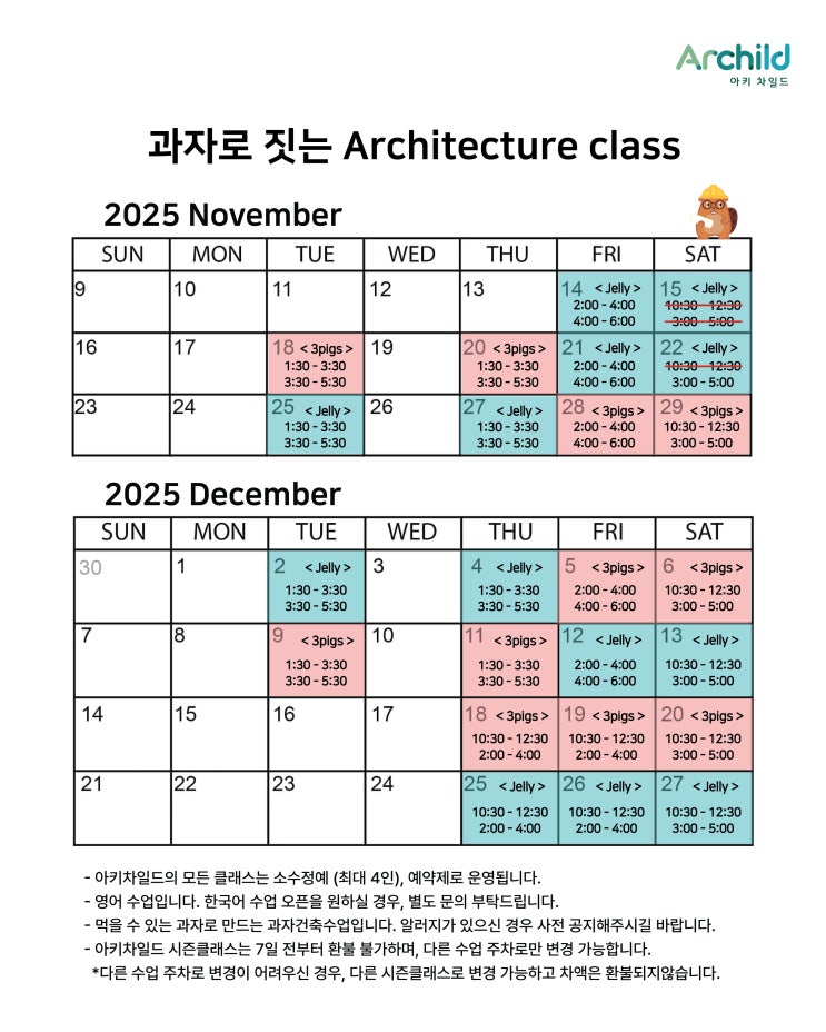 <과자로 짓는 Architecture class> 과자로도 멋진 건축물을 만들 수 있을까요? 아아키차일드에서는 영어로 건축 재료와 도시 디자인을 배우고, 먹을 수 있는 재료로 직접 건축물을 설계·제작하는 겨울 시즌 클래스를 오픈하였습니다. 아이들에게 친숙한 재료인 과자와 젤리를 활용해 건축물과 도시를 디자인해보는 수업으로, ‘건축이란 무엇일까?’에 대해 새롭게 생각해 보며 창의적인 아이디어를 떠올려볼 수 있습니다. Winter 시즌클래스의 주제 1. Jelly City ️ 도시 디자인의 기본 원리를 배우고, 젤리로 도시의 형태를 모델링하며 다채로운 색감과 질감을 표현해보아요! 2. Straw, Wood & Brick House 영어로....... <img src="https://blogthumb.pstatic.net/MjAyNTExMjRfMjU2/MDAxNzYzOTY0Mjg0Nzg5.iGKHqAwfKk0jm5GCWt7XHc7EEjdLZcSnMCtu00NCrd0g.sP2S4UZhReo9tq4CN_INiL2vKRdfHl-xiwYNVsffu24g.JPEG/202511_%C1%A9%B8%AE_%BD%BA%C4%C9%C1%EC-01.jpg?type=s3" />