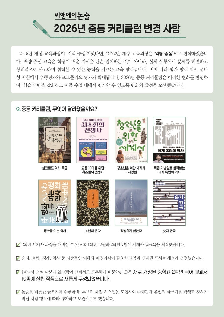 씨앤에이논술 <C&A논술> 12/15 (월) ZOOM 설명회 다시보기 ※ 다시보기 자료 포함 12월 15일 월요일 씨앤에이논술 중등부 프로그램 줌 설명회가 진행되었습니다. 이번 설명회에서는 최근 변화하고 있는 입시 흐름과 관련 뉴스를 중심으로 중등 시기에 어떤 준비가 필요한지 정리하고, 동시에 2026년 씨앤에이논술 중등부가 어떻게 준비되어 있는지에 대해 안내드렸습니다. 설명회에서 사용된 자료는 씨앤에이논술 홈페이지에 첨부되어 있으니, 필요하신 분들께서는 다운로드하여 활용하실 수 있습니다. 씨앤에이논술 홈페이지-12/15(월) ZOOM 설명회 자료 모음 <설명회 주요 내용 안내> ✔️ 최근 입시 뉴스 정리 및 중등 시....... <img src="https://blogthumb.pstatic.net/MjAyNTEyMTZfNTUg/MDAxNzY1ODY2MjIzNDU2.TZ1dJJ0mpV9t8FWtCn7pK0XqDI7OW2bqznuEDh0l0aIg.r1GYlMmrB8lGoOO4TfKvfRGcS60696kXXjZOmKlr7gog.JPEG/%C1%DF%B5%EE_%C4%BF%B8%AE%C5%A7%B7%B3_%BE%C8%B3%BB%B9%AE_%BC%F6%C1%A4.jpg?type=s3" />