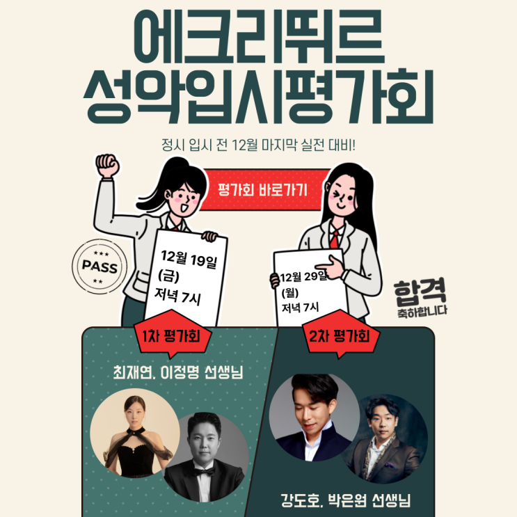 안녕하세요 서울대 선생님들의 레슨 공간, 에크리뛰르 뮤직 아카데미입니다. 정말 입시가 이제 코앞으로 다가왔습니다. 저희 에크리뛰르에서는 성악 선생님들과 함께 무대에서 실전 입시 연습을 진행합니다. 저희는 지난 겨울부터, 입시를 위한 평가회를 상반기와 하반기에 걸쳐 진행하고 있습니다. 무대 경험이 익숙하지 않을 수 있는 학생들에게는 시험 전에 아주 좋은 경험이 됩니다. 특히 저희 선생님들의 통찰력 있는 평가는 학생들이 남은 시간을 어떻게 나아가면 좋을지에 대한 방향을 제시해 주어 입시를 준비하는 학생들이 더욱 또렷하게 시험을 대비할 수 있을 것입니다. 1차 입시평가회 일시 12월 19일 금요일 시간: 17시~19시 - 리허....... <img src="https://blogthumb.pstatic.net/MjAyNTEyMDhfMjU1/MDAxNzY1MTc2OTc5MDA2.o18HWkv7OlxLTl0lpMHmGAZLsk4NnKAWr7d7GsyoSykg.WI1vFh5uG3wlKSx5m89rIQ0TY3d6MA-08R6w5EocO4sg.PNG/%C1%A6%B8%F1%C0%BB-%C0%D4%B7%C2%C7%D8%C1%D6%BC%BC%BF%E4_-001_%2815%29.png?type=s3" />