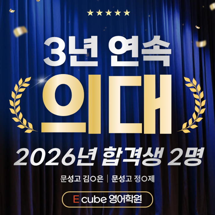 안녕하세요 이큐브 영어학원입니다. 그동안 블로그에 소식을 전하지는 않았으나, 기쁜 소식이 올해 역시도 이어져 소식을 전하고자 합니다. 2026학년도 2명의 의대 합격생, 2024학년도에 이어 3년 연속의 결과입니다. 결과를 크게 알리기 보다는 수업과 학생 관리에 집중해왔으며, 그 결과가 자연스럽게 입시 결과로 이어져온 듯 해 이큐브 학생들이 참 기특하고 뿌듯한 마음입니다. 새 학년을 앞두고 고민이 많은 시기입니다. 늘 그래왔듯 저희는 학생들에게 최선과 진심을 다할 것입니다. 수업 문의는 010-8237-4636으로 연락주시면 자세히 안내드리겠습니다. <img src="https://blogthumb.pstatic.net/MjAyNjAyMTJfMTkw/MDAxNzcwOTAzNzQyNDQx.VYU4jip8itvO6Hff9Wrslzc_RfymgwJ4_Fw3tTb0n_8g.nwZO24UlkKqWq6wx7Vw3X7FjuPkUqw6nHl_fL9HBrfAg.PNG/%C0%C7%B4%EB%282026%29.png?type=s3" />