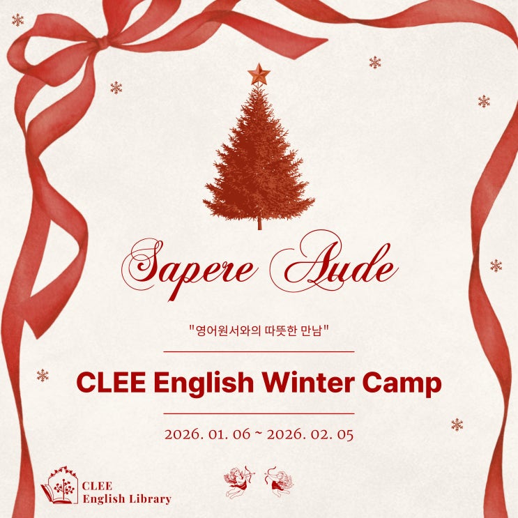 안녕하세요, 클리영어도서관입니다. 이번 겨울, 클리 영어도서관에서 Sapere Aude: The Power of Story CLEE Winter Reading Camp를 진행합니다. 프로그램명: 2026 CLEE Winter Reading Camp: Sapere Aude 수업 개요: 세상에 대한 호기심과 탐구, 이해, 연결 능력을 키울 수 있는 주제로 레벨별 엄선 도서를 활용한 수업 진행 수업 일정: 상단 사진 참고 ※ 레벨은 카톡으로 문의 주시면 전화 드리겠습니다. 클리에 등록하지 않은 외부생 학생도 수강 신청이 가능하며 간단한 테스트 후 반이 배정됩니다. 미리 010 8686 0551로 연락 주시면 테스트 일정 안내 드립니다. ※ ⓑ Level 2, ⓒ Level 3 는 현재 마감되었습니다. * 개강....... <img src="https://blogthumb.pstatic.net/MjAyNTEyMDlfMjkz/MDAxNzY1MjcwMzY3MzM5.GeZO3gEWMA8xv8VqCQq_32VuYZeJfFBa0-35S9Upwb8g.tr2GcN7VX0h_NDeI9grRRH1J4GUpGYZ6Mg1A1LM90z4g.JPEG/001.jpg?type=s3" />