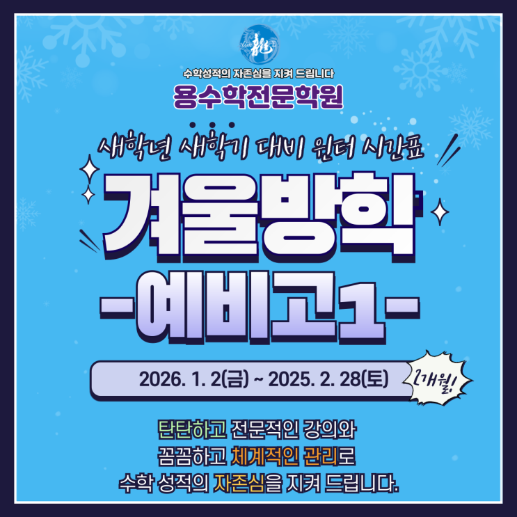 용수학 겨울방학 윈터스쿨 개강 안내 “방학 한 번으로 수학의 체력이 달라집니다” 겨울방학은 학기 중처럼 진도만 따라가는 시간이 아니라, 빈틈을 메우고 다음 학기를 선점하는 시기입니다. 이번 겨울, 용수학은 기존 시스템은 그대로 유지하면서 원장 직강 수업 + 1.5배 수업량 증가 + 선택형 맞춤 특강을 더해 한 단계 더 도약할 수 있는 겨울시즌 프로그램을 준비했습니다. 1. 매일 완성되는 학습 “일일테스트 + 복습 루틴으로 누적 없이 진행” 수업마다 일일테스트로 전 시간 학습을 확인하고 틀린 문제는 바로 복습까지 연결해 그날 학습을 그날 완성합니다. 방학에는 특히 이 루틴의 효과가 크게 나타납니다. 하루씩 정리된 학습이 쌓....... <img src="https://blogthumb.pstatic.net/MjAyNTEyMTBfNjIg/MDAxNzY1MzY5NjE1Nzgx.Iih2oPEZsb9iaF_-YomK0in82cl0WTT_QitxMzZGdvEg.VScg1MKyt87aM8e8ZH26JmF0f7PcRALYjN5pfFL4rj0g.PNG/005.png?type=s3" />
