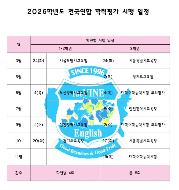 안녕하세요. 더바인잉글리쉬어학원입니다 2026학년도 전국연합학력평가(모의고사) 일정이 발표되어 안내드립니다. 모의고사는 현재 자신의 학업 수준을 점검하고 수능 대비 학습 방향을 설정하는 중요한 시험입니다. 특히 고등학교에 입학하는 학생들과 수능을 준비하는 학생들에게 매우 중요한 기준이 되기 때문에 미리 일정 확인 후 학습 계획을 세우는 것이 필요합니다. 2026학년도 모의고사 시행 일정 (위 이미지 참고) 2026학년도 전국연합학력평가는 고1·고2는 연 4회, 고3은 총 6회 시행됩니다. ✔ 고1 · 고2 모의고사 일정 3월 24일 : 서울특별시교육청 6월 4일 : 부산광역시교육청 9월 2일 : 인천광역시교육청 10월 20일 : 경....... <img src="https://blogthumb.pstatic.net/MjAyNjAzMDZfMTk4/MDAxNzcyNzcwNTAyMzk1.Oz7527z9NGV-I7510rbYWVxCnRzME4T_HFeltN4IucMg.ed4NkGoGccUbN5jQJHzAsitu7Tv8FGDONx6xY6tVLIwg.JPEG/2026%C7%D0%B3%E2%B5%B5_%C0%FC%B1%B9%BF%AC%C7%D5%C7%D0%B7%C2%C6%F2%B0%A1_%BD%C3%C7%E0_%C0%CF%C1%A4001.jpg?type=s3" />