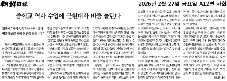 중학교 역사 수업, 근현대사 비중 확대 – 왜 지금 ‘한국 근현대사’인가? 1. 오늘 신문 기사 핵심 정리 정부가 중학교 역사 수업에서 근현대사 비중을 확대하는 방안을 추진하고 있습니다. 기존 교과 과정은 전근대사(고대~조선)가 약 80%, 근현대사(개항 이후)가 약 20% 수준 앞으로는 근현대사 분량과 수업 시간을 늘릴 계획 고등학교에는 역사 콘텐츠를 분석·비판하는 선택 과목도 신설 예정 이유: 학생들이 현재 사회를 이해하는 데 근현대사 지식이 중요하다는 판단 다만, 아직 평가가 끝나지 않은 현대 정치·사회 사건을 다루는 것에 대한 우려 정치적 해석의 다양성 문제 중학생 수준에서 이해하기 어렵다는 지적 등의 논쟁도 함께 나오....... <img src="https://blogthumb.pstatic.net/MjAyNjAyMjdfMjYx/MDAxNzcyMTYyMTExOTcw.1xN1z4y6NkiPQHtpms-WzKImvjse625Yypzc_O2EGGMg.wgr1-6vPJWsVIRkqcv0qvD5t3alUoUHzCvE9XTuzfT8g.PNG/900%A3%DF1772150492232.png?type=s3" />