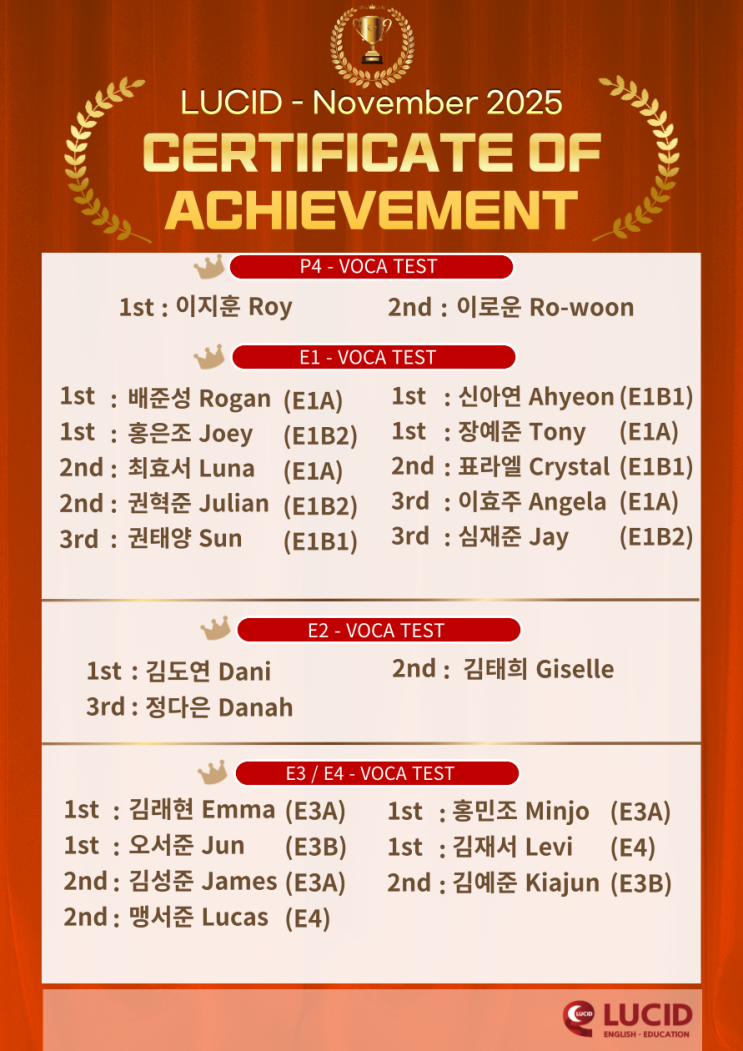 안녕하세요! 위니드교육학원(4F)과 함께하는 초·중등 전문 영어 학원 루시드영어입니다 ~!! 오늘은 루시드 12월 시상식입니다. ❤️ ❤️VOCA TEST❤️ ❤️시상식❤️ 상을 받은 친구들에게 축하의 박수!! 11월 모두 수고 많았어요 ❤️❤️ 25년 12월에도 공부 열심히 해서 좋은 결과로 26년 01월에 만나요~ <img src="https://blogthumb.pstatic.net/MjAyNTEyMTVfMTMx/MDAxNzY1NzgzODI1ODkx.qPQkoZu7wTWvLsQeYEfi4RBZPv0N9mJkAvwH3eaJjXgg.5cCR2JsArj55WTNhKkag0fzzSt_WJRhPQ3TFbpEMUBkg.PNG/002.png?type=s3" />