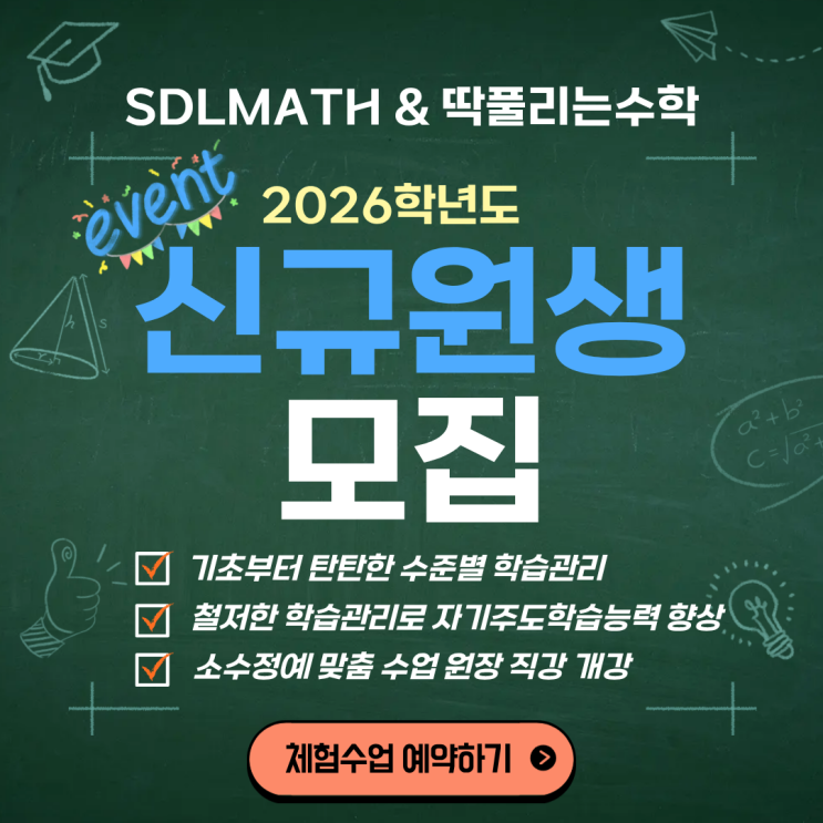 안녕하세요?? 길다면 길고 짧다면 짧은 겨울방학이 지나고 벌써 봄의 향취가 물씬 풍기고 있습니다. 싱그러운 봄을 시작하면서 우리 아이들 수학 공부 어떠신가요? 열심히는 하는데 성적이 오르지 않거나 개념을 외우기만 하고 응용을 못 한다면 지금이 바로 학습 방향을 점검할 시점입니다. “수학은 왜 우리 아이만 어려워할까요?” 많은 학부모님들께서 가장 많이 하시는 질문입니다. 수학은 누적 과목입니다. 단 하나의 개념이라도 정확히 이해하지 못하면 문제 풀이 과정에서 반드시 흔들립니다. 그래서 중요한 것은 속도가 아니라 정확한 개념 이해와 맞춤 관리입니다. 청라에서 개념 중심 수업으로 입소문이 난 SDLMATH & 딱풀리는수....... <img src="https://blogthumb.pstatic.net/MjAyNjAyMjRfMjEg/MDAxNzcxOTMwNTc2MDgz.1fydX-At5ORO10R7ehBtFerpLQXuneGY6ibyxUnn1tsg.weSz-cg5R91ymuHYW_ocGGCWVprdrDe651H0lGksOSYg.PNG/2026_%BD%C5%B1%D4%BF%F8%BB%FD%B8%F0%C1%FD.png?type=s3" />