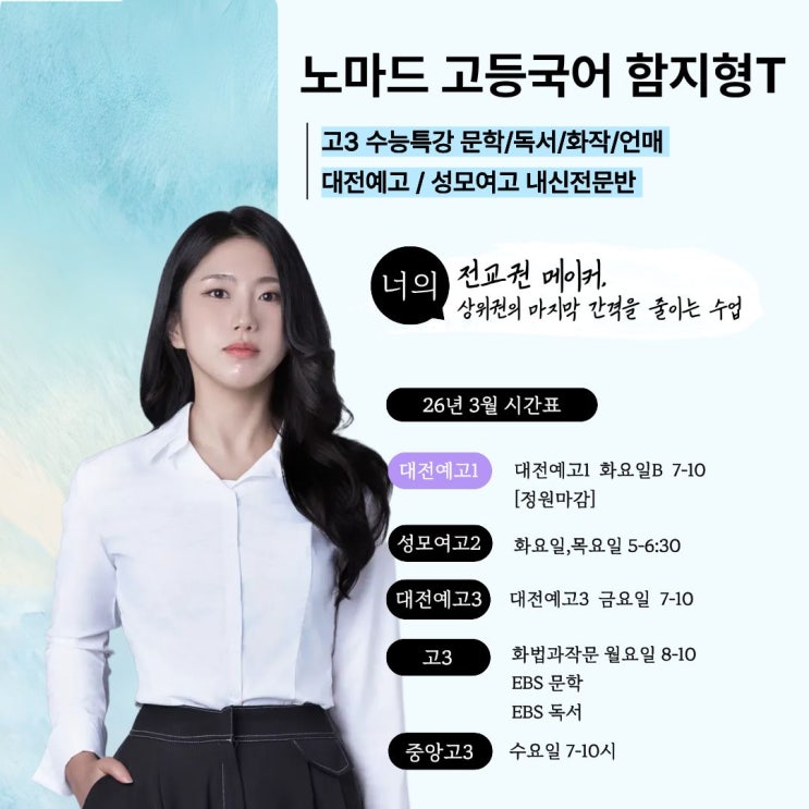 [노마드 고등국어] 상위권의 마지막 간격을 줄이는 힘 안녕하세요, 노마드 국어영어학원 함지형T입니다. 상위권 학생들에게 국어는 늘 불안한 과목입니다. 1등급과 2등급을 가르는 것은 한두 문제의 차이이고, 그 한 끗 차이는 단순히 문제를 많이 푼다고 해서 좁혀지지 않기 때문입니다. 노마드가 말하는 상위권 수업은 단순히 난도가 높은 수업이 아닙니다. 결과를 만드는 '과정'의 밀도가 다른 수업, 함지형 국어의 설계 방식을 소개합니다. 함지형T의 수업 설계: "결과는 준비 과정에서 결정됩니다" 상위권의 자리를 굳건히 지키고, 전교권으로 도약하기 위해 저는 세 가지 핵심 시스템을 가동합니다. 1. 루틴 속에서 &#....... <img src="https://blogthumb.pstatic.net/MjAyNjAyMjdfMTYz/MDAxNzcyMTg4MzgyMjE5.zT8rOa7CfT6twYP5E86aRj8X5JM-usCDw1c_69HjKdIg.qlgGLJQ9UArxiHY3lhLwjiUllBnyXHRndlTKb5UheTkg.JPEG/2-%C7%D4%C1%F6%C7%FC_%C1%A4%BB%E7%B0%A2.jpg?type=s3" />