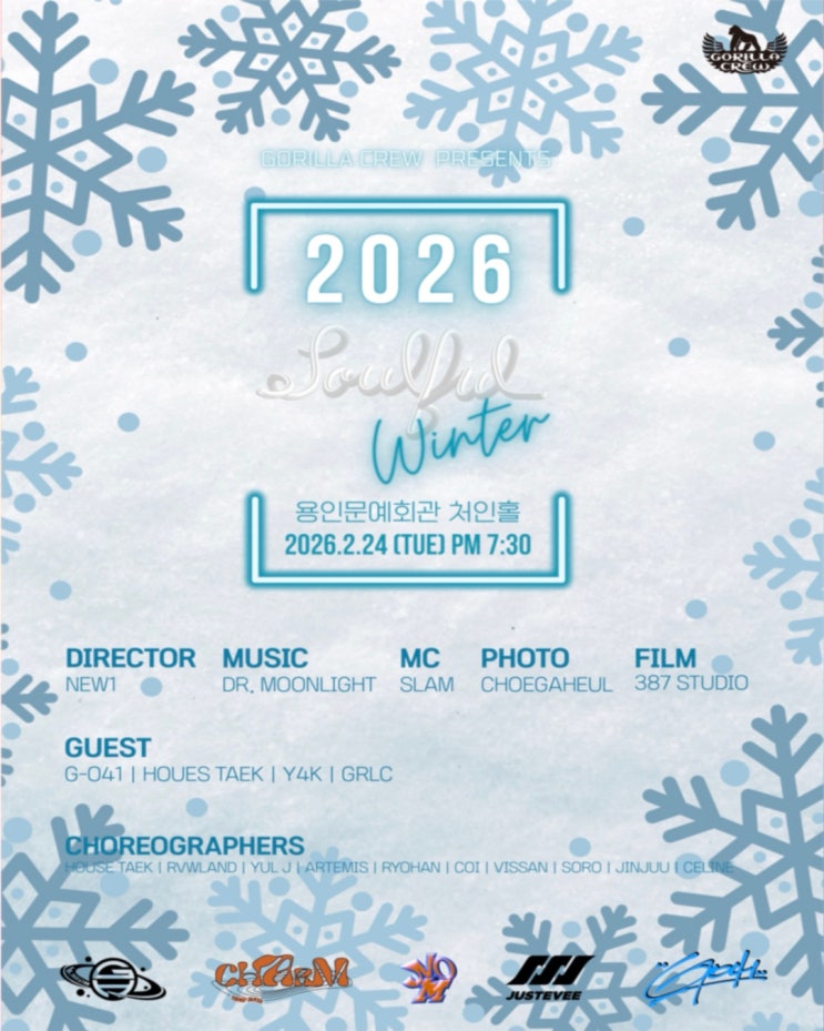 2026년 2월24일 오후 7시30분 용인문예회관 처인홀에서 고릴라크루가 주관하는 <Soulful Winter> 공연이 펼쳐집니다. 고릴라크루 댄스학원의 학생들의 공연과 프로 댄서들의 멋진 공연을 함께 즐기실 수 있습니다~!!! 공연문의: 010-8109-3623 <img src="https://blogthumb.pstatic.net/MjAyNjAyMThfMTU4/MDAxNzcxMzgzNjYzODY0.lsB1G-ImQtJ-cGSVcUVHqvYc4ODaRdAcHqEab4ikGzAg.DLxmV6e-yWUvL2iRnJ7agCGIq5Hd5OPkqHWeA4cvsPwg.JPEG/KakaoTalk_20260218_103134560_02.jpg?type=s3" />