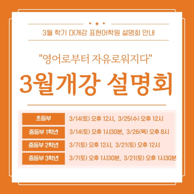새학기, 영어 공부의 방향을 잡는 가장 중요한 시간 ★ 3월학기 대개강 학부모 설명회 신청 클릭!! ★ 안녕하세요 “영어로부터 자유로워지다” 중계동 영어전문학원 "표현어학원 중계캠퍼스" 입니다. 어느덧 겨울방학이 끝나고 새로운 학년이 시작되는 3월이 되었습니다. 3월은 단순히 새 학기가 시작되는 시기가 아니라 한 해의 학습 흐름이 결정되는 중요한 출발선이기도 합니다. 특히 영어는 한 번 흐름이 무너지면 다시 잡기가 쉽지 않은 과목이기 때문에 새학기 시작 시점에서 방향을 잡는 것이 무엇보다 중요합니다. 그래서 표현어학원에서는 2026년 3월학기 대개강을 앞두고 초등/중등부 학부모 설명회를 준비했습니다. 3월은....... <img src="https://blogthumb.pstatic.net/MjAyNjAzMDVfNTMg/MDAxNzcyNjM2NjEzMTQ1.3nQ_SJW3bfO2Dk7xSPojqCea210ZJhSiXPMar1NEsacg.zWIsdu5oFO_12_tqB7S4s6kdOEM2N37uNKfjOz1gZBkg.JPEG/001.jpg?type=s3" />