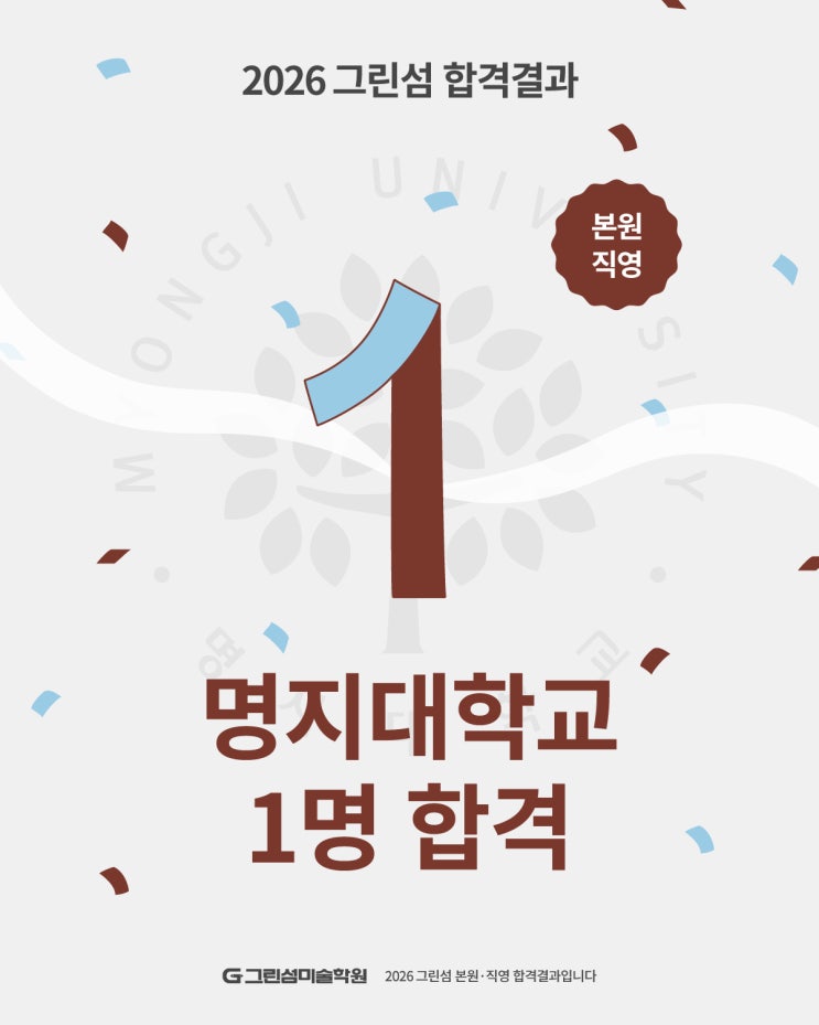 실력으로 합격을 설계하는 상위권 미대입시의 절대 공식 그린섬미술학원 본원직영 2026학년도 명지대학교 합격결과 공개 격렬한 입시전쟁이 마무리되고 2026 명지대학교 미대입시 합격결과가 발표되었습니다. 지치지 않는 열정과 노력 끝에 합격을 거머쥔 학생 여러분 고생 많으셨고 모두 진심으로 축하드립니다! 다가오는 2027학년도 미대입시에서도 많은 학생들이 원하는 대학에 합격할 수 있도록 그린섬이 함께 노력하겠습니다! 추후 합격재현작이 공개됩니다 To Be Continued #홍대그린섬, #홍대그린섬미술학원, #그린섬미술학원, #명지대학교, #명지대, #미대, 합격, #합격자, #홍대미술학원 <img src="https://blogthumb.pstatic.net/MjAyNjAyMTlfMjYx/MDAxNzcxNDgyODI3ODE1.k0UDCotPaaO95q2gMnmBUKAaod9HZPmG10A6rgUveQUg.QBToZ14hUYXOJRWx9TXbSZNWAHT4t4rfpR8Fyl7cOHEg.JPEG/2%C7%D0%B1%B3%BA%B0-27%B8%ED%C1%F6.jpg?type=s3" />