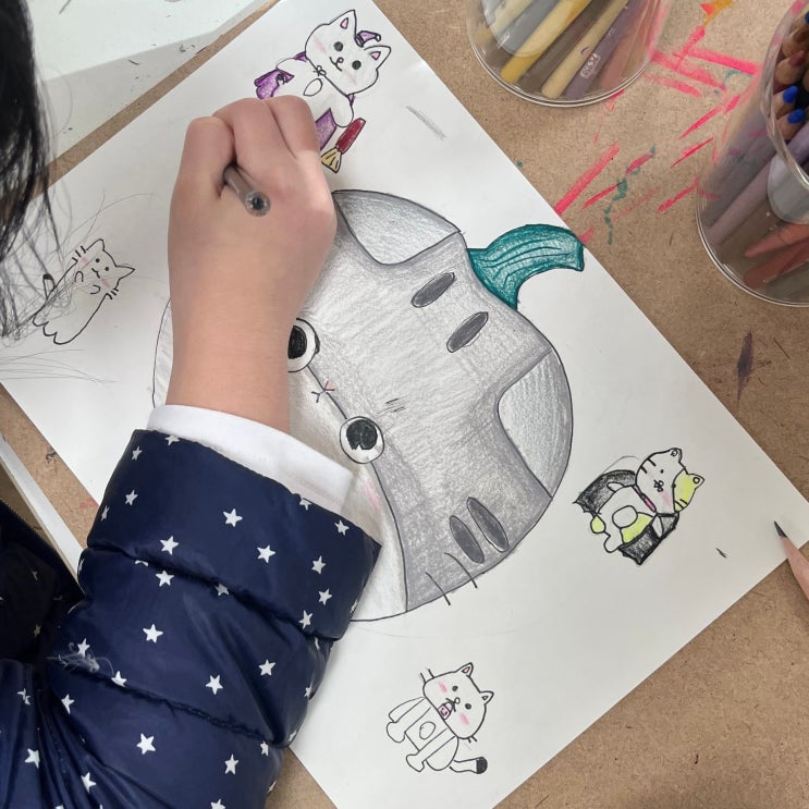 안녕하세요! 포제트미술학원입니다. 이번 시간에는 다가오는 할로윈을 맞아 특별한 미술 수업을 진행했습니다. 평범한 호박 그리기는 재미없겠죠? 우리 포둥이들의 상상력을 더해, "내가 좋아하는 캐릭터나 동물이 호박이 된다면?" 이라는 주제로 그림을 그려보았어요. 먼저, 호박의 모양을 자세히 관찰하며 형태를 익히는 시간부터 가졌습니다. 크고 굵은 주름을 살려 호박의 입체감을 표현해주고, 빼놓을 수 없는 호박 꼭지도 꼼꼼하게 그려주었어요. 호박의 중앙에는 아이들이 좋아하는 캐릭터의 얼굴이나 귀여운 동물 표정을 넣어 세상에 하나뿐인 나만의 호박을 완성했습니다. 배경에는 박쥐, 거미줄, 유령 등 할로윈 분위기....... <img src="https://blogthumb.pstatic.net/MjAyNTEyMDVfMTYz/MDAxNzY0OTExNzYyMTQ2.mT5KCz1bYrauN5gGGipzWWtaJ9R_trKpWnH_zri4dD4g.eogsvWJ3U5HzN5Qxzvc8tFYmKPTq46k2LpukgNdJLsEg.JPEG/IMG_1588.jpg?type=s3" />