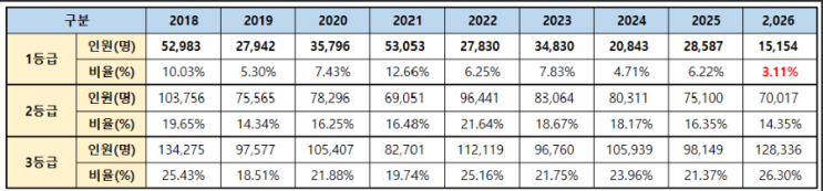 2026대학수학능력시험 영어 결과발표 영어 영역결과와 평가 영어 영역은 절대평가로 치르는데도 가장 까다로웠다는 분석이다. 일각에선 '역대급 불영어'라는 평가까지 하고 있다. 대개 영어의 난이도는 1등급 비율로 가늠한다. 수능 채점 결과 해당 비율은 3.11%(1만5154명)에 불과했다. 상대평가 1등급 비율이 4%대인 점을 감안하면 훨씬 어렵게 출제된 셈이다. 전년도 수능 영어 1등급 비율은 6.22%(2만8587명)였고, 1등급 비율이 12.66%로 가장 쉬웠던 2021 수능때 1등급인원이 53,053이었던 것에비해 올해1등급 인원은 15,154명이고 2등급까지 합한 인원도 17.5%밖에 안되는 가장 적은 비율이다. 수시모집에서 수능최저기준을 충족....... <img src="https://blogthumb.pstatic.net/MjAyNTEyMDRfMjA5/MDAxNzY0ODMxMzQzMjYw.n4lmCW6OzqMC1TmYAvpV-v9mxor64PY4vpF2OJQbdigg.fUUrC2lfWJtgKFHpuYOHkM7YSZXFq9n7y0dC19IQk0Yg.PNG/image.png?type=s3" />