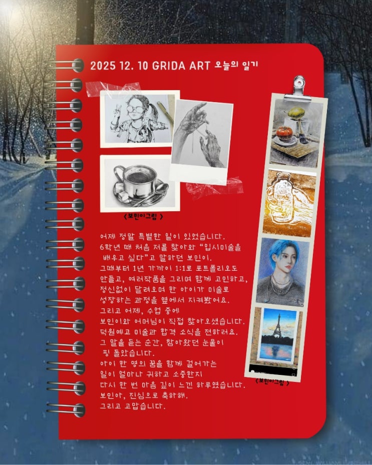 어제 정말 특별한 일이 있었습니다. 6학년 때 처음 저를 찾아와 “입시미술을 배우고 싶다”고 말하던 보민이. 그때부터 1년 가까이 1:1로 포트폴리오도 만들고, 여러작품을 그리며 함께 고민하고, 정신없이 달려오며 한 아이가 미술로 성장하는 과정을 옆에서 지켜봤어요. 그리고 어제, 수업 중에 보민이와 어머님이 직접 찾아오셨습니다. 덕원예고 미술과 합격 소식을 전하러요. 그 말을 듣는 순간, 참아왔던 눈물이 핑 돌았습니다. 아이 한 명의 꿈을 함께 걸어가는 일이 얼마나 귀하고 소중한지 다시 한 번 마음 깊이 느낀 하루였습니다. 보민아, 진심으로 축하해. 그리고 고맙습니다♡ 그리다 인스타그램 주소예요 https://www.instagram.co....... <img src="https://blogthumb.pstatic.net/MjAyNTEyMTBfMzcg/MDAxNzY1MzM0MjU0MzQw.EehEABFZufHregXeWeI0tWJY82-En_Vo3NLMxJatlwAg.0h71FVNK3bQWbfRJIHr9IV-nMfHX-GcTQnCcU4RqymAg.JPEG/900%A3%DF1765334223348.jpg?type=s3" />