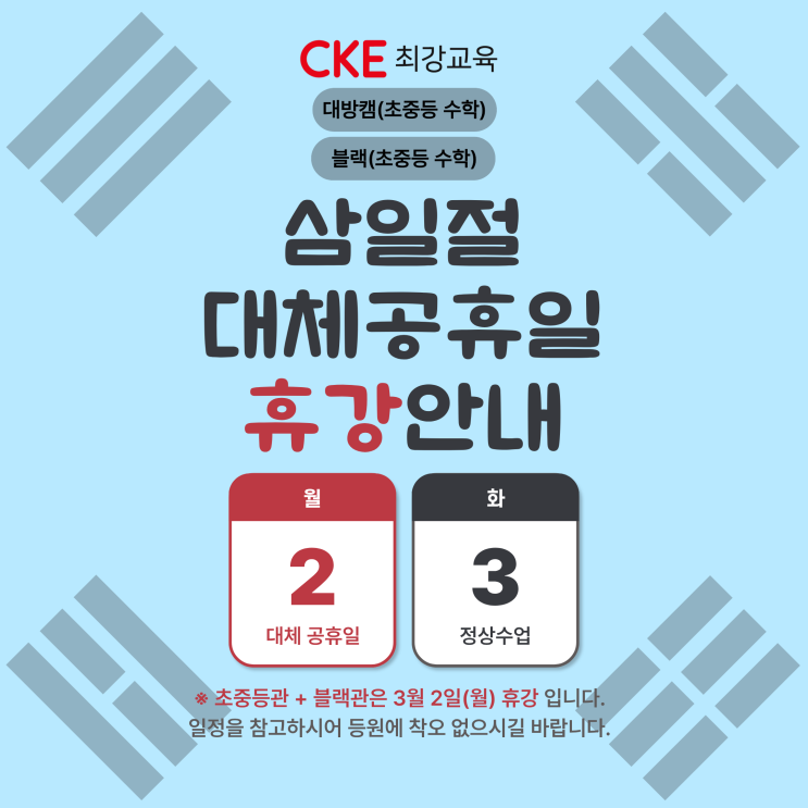 안녕하세요. 최강교육 초중등관/블랙관 입니다. 3월 2일(월) 삼일절 대체공휴일 수업 모두 휴강이니, 참고 부탁드립니다. 3월 2일 제외하고는 모두 정상수업입니다. 감사합니다. 최강교육 초중등/블랙 | 상담문의 ☎ 02-823-8976 / 010-9943-8976 <img src="https://blogthumb.pstatic.net/MjAyNjAyMjdfMjE1/MDAxNzcyMTk3MDQxNzc3.9gRX_olb5Hw7X-N6wo7eCopJmEGBxIusZMJ-lfirN3sg.pt8BWjUoLhjPf9q7mXECL6CVK0V5NiqLCDYFXXKFwvgg.PNG/%B4%EB%C3%BC%B0%F8%C8%DE%C0%CF_%C8%DE%B9%AB%BE%C8%B3%BB.png?type=s3" />