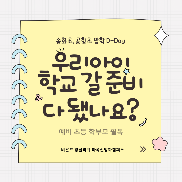 안녕하세요? 비욘드 잉글리쉬 마곡 방화캠퍼스어썸애니원장입니다. 마곡 엠벨리 송화초, 공항초, 송정초 예비 학부모님들의 설레는 첫 출발을 응원합니다. 아이가 어린이집이나 유치원을 졸업하고 처음으로 "학교"라는 큰 사회에 발을 내딛는 시기입니다. 우리 아이가 학교에 잘 적응할 수 있을지 걱정이 많으시지요? 저도 제 아이들을 초등학교에 입학시키기전에 정말 많은 정보를 찾아보고 아이의 학원 스케줄을 조율하면서 많은 고민으로 밤잠을 설쳤던 기억이 생생합니다. 그래서 저희 비욘드 잉글리쉬 마곡 신방화캠퍼스 영어학원에서 엠벨리 예비 초등 부모님들의 고민을 덜어드리고자, 초등학교 입학전 꼭 체크해야 할 "슬....... <img src="https://blogthumb.pstatic.net/MjAyNjAyMDVfNjcg/MDAxNzcwMjIzMzUyMTU2.lEyVJE_6ud5WjsLFRU6kgddctfDnH7VYxQJb6BFRVCYg.23abKNLkOVAl-r_eKF22BzNZnMLaIFkKvzGEA9f4Ipsg.PNG/1.png?type=s3" />