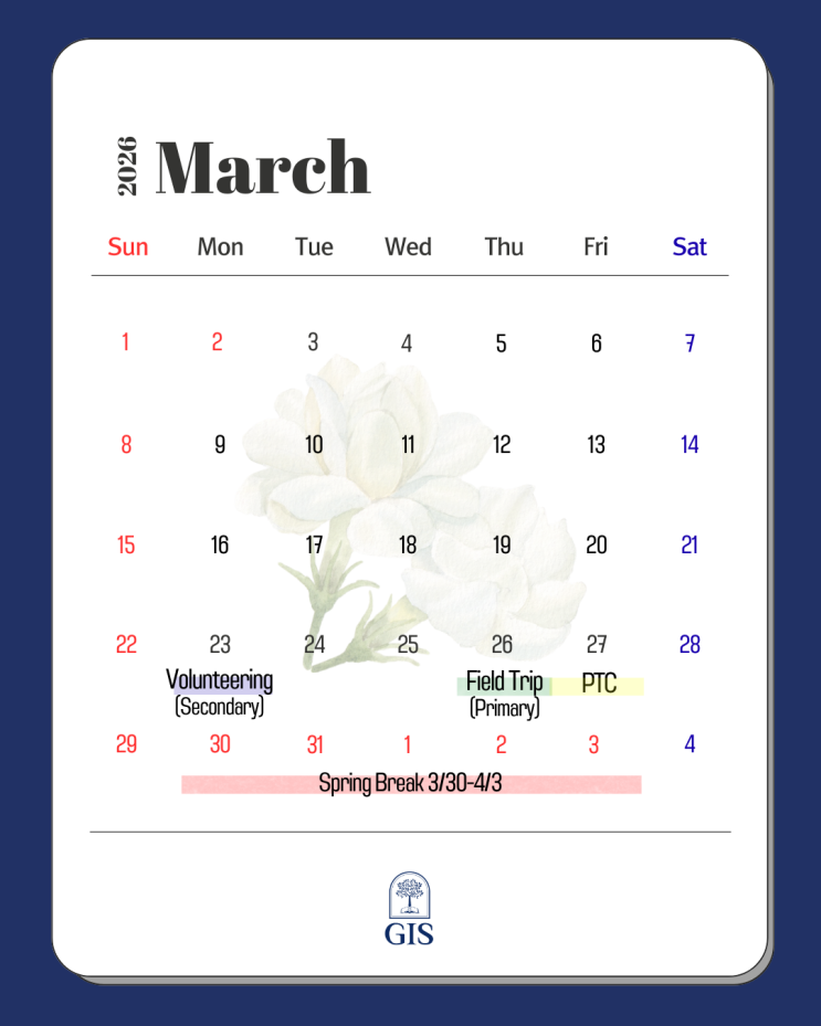 안녕하세요, GIS 여러분! 따뜻한 봄바람과 함께 찾아온 3월을 맞아, GIS 강남국제학교의 전반적인 주요 일정을 안내해 드리고자 합니다. 3월 24일 (화) Secondary Volunteering Secondary 학생들이 교실 안밖에서 봉사활동을 하는 시간을 가집니다. 3월 26일 (목) Primary Field Trip Primary 학생들이 교실 밖 자연 속에서 오감을 활용해 봄을 느끼고 배우는 특별한 시간이 준비되어 있습니다. 3월 27일 (금) Parent Teacher Conference (PTC) 선생님과 학부모님이 함께 아이의 성장을 논의하는 중요한 행사 입니다. 상세 시간은 추후 개별 공지됩니다. 3월 30일 (월) ~ 4월 3일 (토) Spring Break (봄방학) 즐거운 봄방학 기간입니다. 학생들이....... <img src="https://blogthumb.pstatic.net/MjAyNjAyMjdfMjY4/MDAxNzcyMTU0NDQyNjUw.XzA0MA0dcNzyVIfV_Lz_1y6WehmG1f6bzKpAF6YJ0y4g.WIGrP787B_G-R2TXxlb5UnQkzCic1nXv6kbkngt_fi0g.PNG/%B4%DE%B7%C2_%284%29.png?type=s3" />