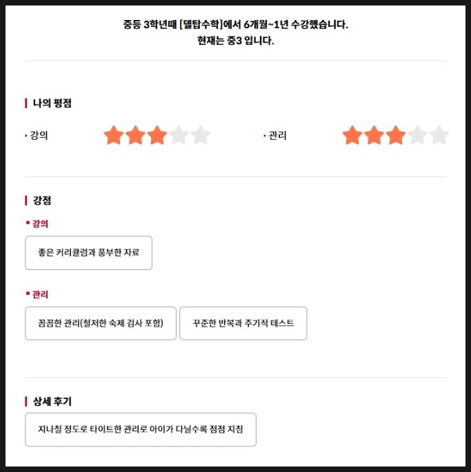 안녕하세요. 델탑수학 원장 장지은입니다. 디스쿨에 제 수업 후기가 올라왔더라고요. 지나칠 정도로 타이트한 관리로 아이가 다닐수록 점점 지침 네, 맞습니다. 저희 학원 빡셉니다. 그런데 저는 이 후기를 보면서 한 가지 생각을 했어요. "왜 타이트한지를 제대로 설명해 드린 적이 없었구나." 오늘은 그 이야기를 솔직하게 해보려고 합니다. 저희가 실제로 하는 것들 1. '무엇을 풀릴까'보다 '왜 풀릴까'가 먼저입니다. 어머님들이 상담 오시면 교재 이야기가 꼭 나와요. 어차피 다른 학원도 비슷한 문제집 쓰는 거 아니냐고요. 맞습니다. 교재 자체는 크게 다르지 않습니다 그런데 저는 이렇게 생각해요. 어떤....... <img src="https://blogthumb.pstatic.net/MjAyNjAyMjZfNDkg/MDAxNzcyMTExMzY0MjI4.-VSBKF5BSP3rdgEJb4u9D4ufqgrLeFOn59GOOP9drtwg.JL_hnxq5UArmpaoN6FuMoNpvil3kHrTAuh6to3V_Qf8g.JPEG/K-1223.jpg?type=s3" />