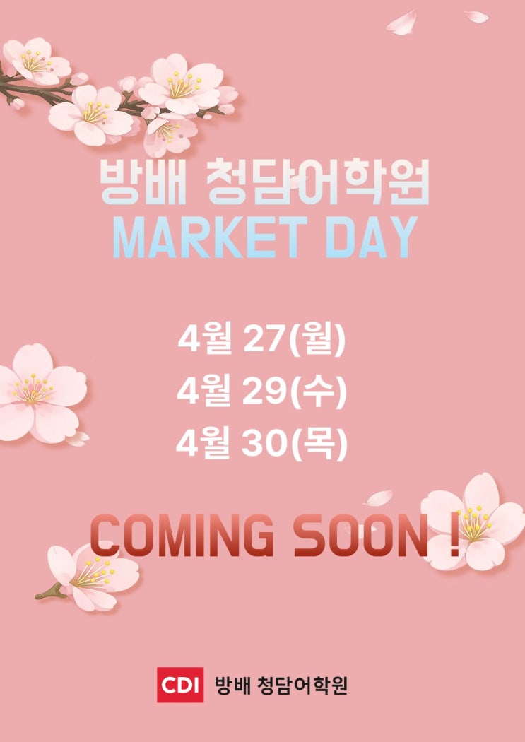 청담어학원 방배브랜치에서 열심히 공부하는 우리 친구들을 위해 MARKET DAY를 오픈합니다 ! 다양한 선물들을 준비할 예정이니 모두 열심히 공부해서 원하는 선물들 얻어가길 바래요 :) <img src="https://blogthumb.pstatic.net/MjAyNjAzMTdfMTI4/MDAxNzczNzQ3NDY2NTgx.pPyhyV6xK6HytQVKw9pV7-SUVEh7hWSVdH3Yg5aMfqkg.NAnzEZdvEUDxzIXw54qA2Q7uRY6Kvh3AkRLWOKHgGyUg.JPEG/%C1%A6%B8%F1%C0%BB_%C0%D4%B7%C2%C7%D8%C1%D6%BC%BC%BF%E4._%285%29.jpg?type=s3" />