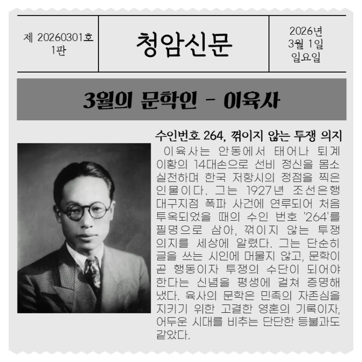 안녕하세요 청암국어학원입니다. 여러분은 3월하면 무엇이 떠오르나요? 개학, 새로운 출발 등 다양한 단어가 떠오를 것 같아요. 그러나 우리 3월의 첫 번째 날인 3월 1일은 우리 역사에서 특별한 의미를 지닌 날입니다. 바로 3.1운동이 일어난 날이기 때문이죠. 일제의 억압 속에서도 수많은 사람들이 독립을 외치며 거리고 나섰고, 그 열망은 다양한 방식으로 이어졌습니다. 그중에는 시와 글로 저항의 뜻을 드러낸 인물들도 있었습니다. 이번 3월 신문에서는 이러한 시대적 배경 속에서 활동한 시인, 이육사를 선정하여 그의 삶과 작품을 함께 살펴보고자 합니다. 이육사는 일제강점기라는 어두운 시대 속에서도 굴하지 않고 저항의 목소리를 낸....... <img src="https://blogthumb.pstatic.net/MjAyNjAzMTdfNDAg/MDAxNzczNzM1MDI4Nzgz.cNVnihau6QG2qulxhlLCg8dhpydGvp1Fk6quyt061oUg._HYt_NPBaYOh676WoH8Vlzk7Qyl3X4iOZ1S2C5AQUlYg.PNG/image.png?type=s3" />