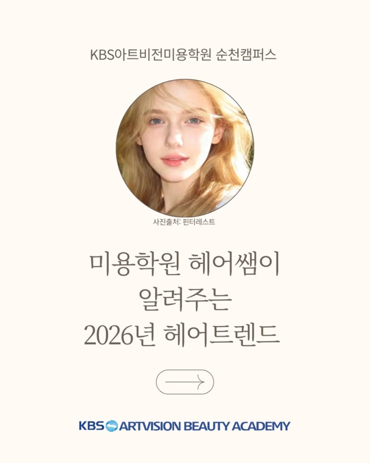 2026년 헤어 트렌드는 자연스러움 + 실용성 + 스타일 포인트가 핵심입니다! 미용 현장에서 바로 활용 가능한 인기 스타일 4가지를 소개해드릴게요 ♀️ ✔ 롭 헤어(Lob Hair) 중단발 기장의 스테디셀러 스타일로 얼굴형 보완과 관리 편의성이 뛰어납니다. ✔ 버킨뱅(Birkin Bang) 풀뱅과 시스루뱅의 중간 느낌으로 내추럴한 분위기를 연출하는 트렌디 앞머리 스타일입니다. ✔ 레이어드 컷(Layered Cut) 가볍고 볼륨감 있는 실루엣으로 두상을 보완해주는 필수 커트 스타일입니다. ✔ 빈티지펌(Vintage Perm) 자연스럽고 자유로운 웨이브로 감성적인 분위기를 살려주는 스타일입니다. 트렌드는 곧 실력입니다! KBS아트비전미용학원에서는 최....... <img src="https://blogthumb.pstatic.net/MjAyNjAxMjdfMTY4/MDAxNzY5NTE0MzIyNjgw.r5IntrfMvDFn7v4ZHEhpL-6HnCoQm9p-2fvERukDJUMg.bpRMoU0rwIm4BOJqZkBDibXCOIcSIGe5EIQZ8CrBk0sg.JPEG/IMG%A3%DF1557.jpg?type=s3" />