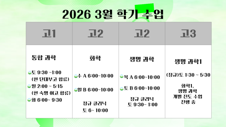 학원 수업 시간표는 특별한 일 없는 한 1년간 변동이 없습니다. 다만, 2026년도는 아무래도 고3 수업을 다소 축소하고는 있습니다. 중3 대상 고등 화학 전 과정을 11월까지 계획 중인데, 고민이 많이 되어 시간표 업로드가 다소 늦은 점 양해 부탁드립니다. 반드시 진행 되어야 할 수업이지만, 동기 부여나 메타 인지가 아직 빈약한 중등부 학부모님들 내지는 학생들과 소통이 될까....가 조금 주저하게 만드네요ㅠ. **개설된다면 화요일 6~10시 블락입니다.** 고1 통합 과학 내신 수업 궁금해 들 하시는데요... 기존 방식과 마찬 가지로 한 타임에 4명, 학교는 2개 맥스로 넣습니다. 1학년들이 워낙 들락거려서, 어느 학교 반이라고 단정은 어렵....... <img src="https://blogthumb.pstatic.net/MjAyNjAyMjVfMjMw/MDAxNzcyMDAyNDAxMjkx.jCGiRKdxgluCHWef1dAviTOS0fh7MIM8g52nabKjTmkg.WHJj7FwHtD_E6IUgAJKVhH13PsGfxHRz0OQFke-DjVUg.PNG/2026_3%3F%9B%94.png?type=s3" />