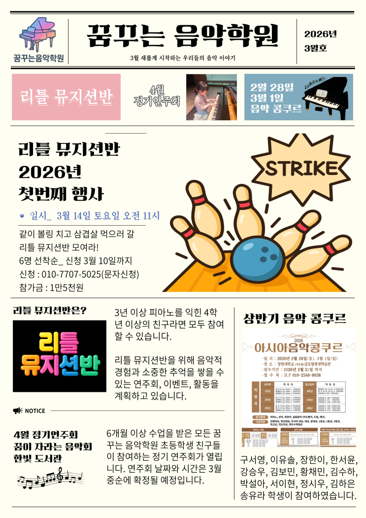 2026년 3월, 꿈꾸는 음악학원이 시작하는 새로운 이야기 따뜻한 봄과 함께 꿈꾸는 음악학원의 2026년 3월호 소식을 전해드립니다. 새 학기, 새로운 친구들, 그리고 우리 아이들의 한 뼘 더 성장할 시간을 준비했습니다. 리틀 뮤지션반 2026년 첫 번째 행사 올해 리틀 뮤지션반의 첫 행사는 3월 14일 토요일 오전 11시 이번에는 조금 특별하게, 볼링도 치고 맛있는 식사도 함께하며 연주실 밖에서 추억을 쌓는 시간을 가지려고 합니다. 리틀 뮤지션반은 단순히 연주 실력만을 키우는 반이 아닙니다. 함께 연습하고, 함께 무대에 서고, 함께 웃으며 음악 안에서 친구가 되어가는 모임입니다. ✔ 6명 선착순 ✔ 신청 마감 3월 1....... <img src="https://blogthumb.pstatic.net/MjAyNjAyMjVfMjQ0/MDAxNzcyMDE0Njc3NTc0.0ZDcpPU70vhtZdFLxEckgKwwrtDgP3eF3qR9DONmZb8g._UqSN83HHtoCSMC1TcxsRmIWoFrySr5_b58bpBhcf3Qg.PNG/%C1%A6%B8%F1%C0%BB_%C0%D4%B7%C2%C7%D8%C1%D6%BC%BC%BF%E4.png?type=s3" />