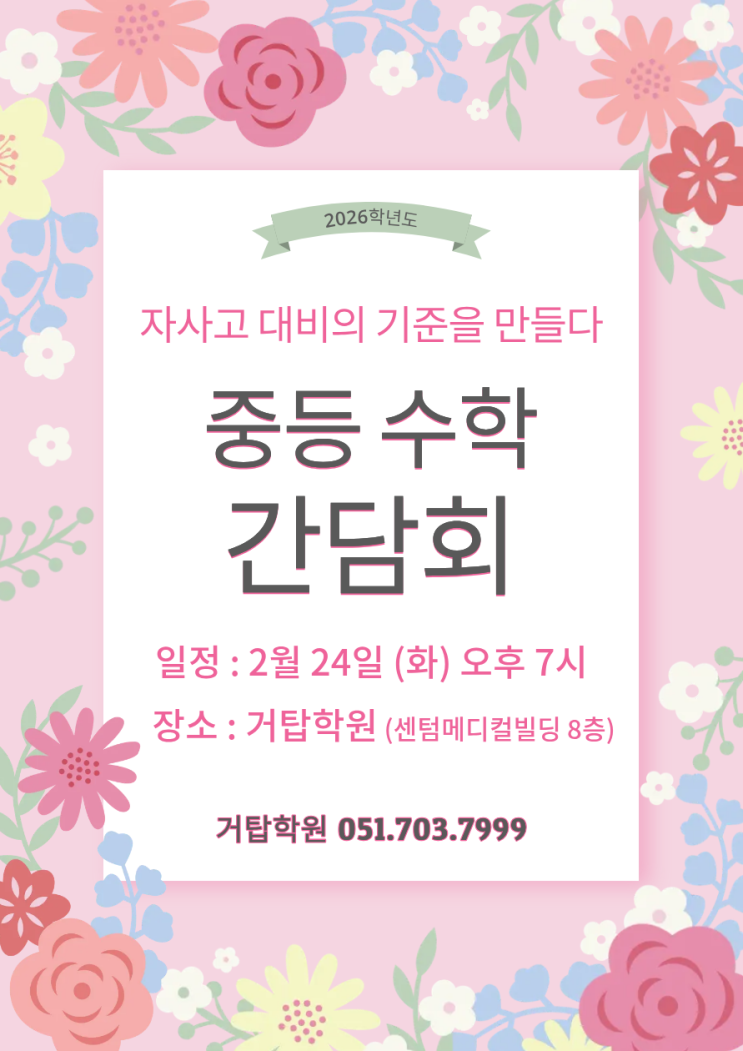 안녕하세요! 자사고 수업으로 입소문난 거탑이 이번 3월부터 중등부 수업을 OPEN 하게 되었습니다. 그동안 자사고 전교1등과 일반고 전교1등을 배출한 거탑이 OPEN하는 중등부 수업도 기대하셔도 좋습니다. 벌써 학부모님의 입소문으로 중등에서 초등 학부모님까지 문의가 쇄도하고 있습니다. 수업 관련 자세한 안내를 돕기 위해 간담회를 마련했습니다. 간담회에 참석하셔서 우리 아이의 고등 과정을 어떻게 진행해야 하는지? 현재 선행 중이라면 전략적으로 잘 하고 있는지? 점검하는 시간도 가져보시길 바랍니다. 거탑이 하면 다릅니다!! 학습 관리 시스템 연사 : 조재근 원장 -한국과학영재고 조기졸업 -KAIST 기계공학부 -현) 거탑....... <img src="https://blogthumb.pstatic.net/MjAyNjAyMTRfNDgg/MDAxNzcxMDc3OTg5MjIw._ypZqOEUG6gzr1aLejr6fbT_TzGKYJURlC7jNwuy0a4g.woa1hTBF79WuBSyoDYvIEzmYCKR732NZnLZ0IHRb3Wog.PNG/%C1%DF%B5%EE_%BC%F6%C7%D0_%B0%A3%B4%E3%C8%B8.png?type=s3" />