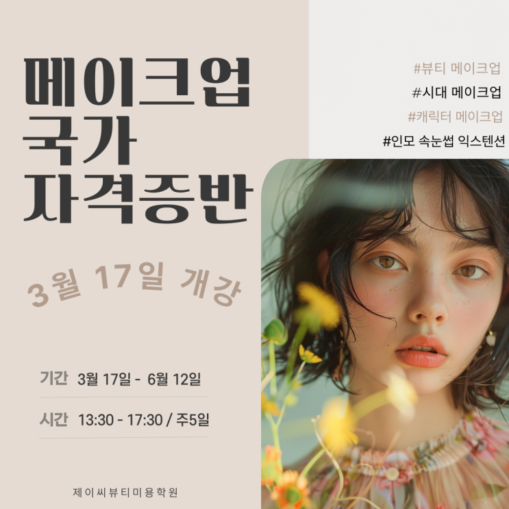 안녕하세요! 여러분의 뷰티 꿈을 현실로 만드는 제이씨뷰티미용학원입니다~ 많은 분이 기다리셨던 메이크업 국가자격증반이 드디어 3월 17일에 문을 엽니다! 이번 과정은 기초 이론부터 실기 시험의 핵심 과제까지 탄탄하게 마스터할 수 있도록 구성되었습니다. 자격증 취득을 고민하고 계셨다면, 이번 개강 일정을 놓치지 마세요! 메이크업 국가자격증 취득을 꿈꾸는예비 아티스트분들을 위해, 실기 시험의 핵심 구성부터 합격률을 높이는 꿀팁까지 한눈에 보기 좋게 정리해 드립니다. 이 포스팅 하나면 실기 준비의 큰 틀을 완벽히 잡으실 수 있을 거예요! 메이크업 국가자격증 실기 시험 개요 실기 시험은 총 2시간 30분 동안 진행되....... <img src="https://blogthumb.pstatic.net/MjAyNjAyMjRfMTY4/MDAxNzcxOTA5ODU3Nzkw.WkEwiiLRwqJpz6xmh3u_-N54v5gEee8Och8U2rthFxMg.2wz5QVyt_nbpwrGNEVfTc-8W5AlDLFuDbFW_VLfCnkQg.PNG/%C1%A6%B8%F1%C0%BB-%C0%D4%B7%C2%C7%D8%C1%D6%BC%BC%BF%E4_-009_%281%29.png?type=s3" />