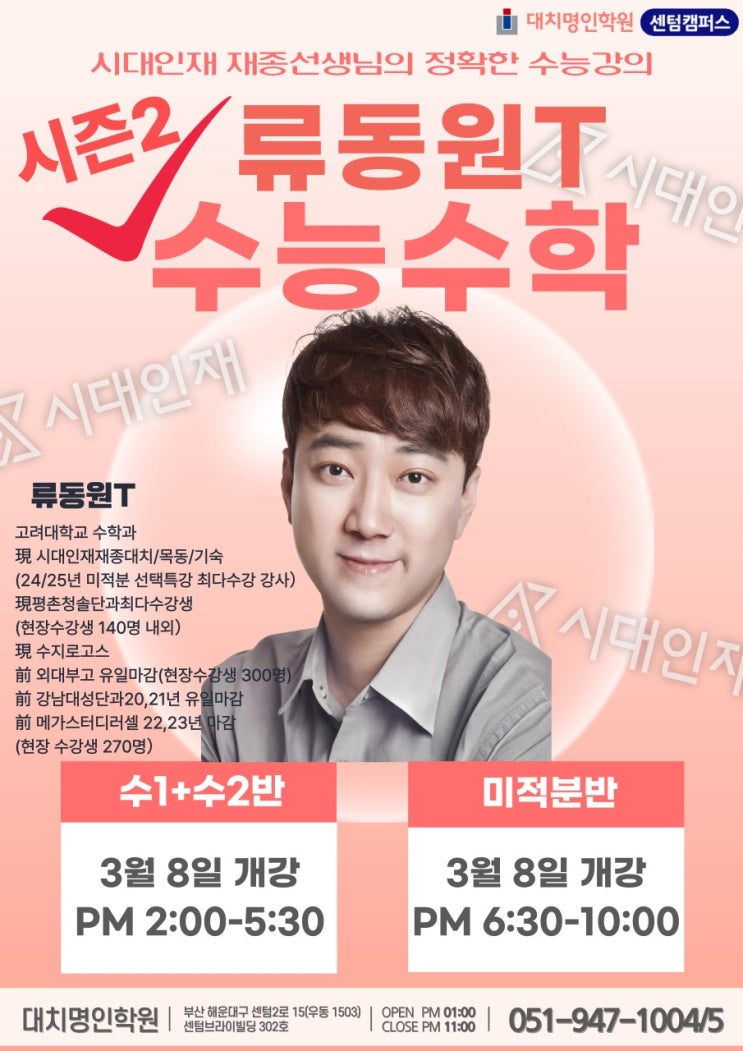 류동원T 시즌2 수능수학 공통과정반[수1,2] ■수업일정 : 3월 8일 (일) 개강 ■수업시간 : 일요일 오후 2시 ~ 5시 30분 ■수업구성 -Preview Test+기출분석+주요문항&자작문항 워크북 -평가원의 출제의도를 넘어 만점을 위한 첫번째 포석 ■클리닉 : (1) 카카오 채널 + 24시간 온라인 질의응답 서비스 (2) 수업 전 후 류동원T 질의응답 미적분과정반 ■수업일정 : 3월 8일 (일) 개강 ■수업시간 : 일요일 저녁 6시 30분 ~ 10시 ■수업구성 -Test+개념+기출분석+주요문항 워크북 -수능+내신을 모두 커버하는 정확한 개념 ■클리닉 : (1) 카카오 채널 + 24시간 온라인 질의응답 서비스 (2) 수업 전 후 류동원T 질의응답 ☆일정 3....... <img src="https://blogthumb.pstatic.net/MjAyNjAyMTRfMTc1/MDAxNzcxMDUyODM5MTY3.wQOcX0dLZAr1VHoAkE7NyVST23woTF12vHvLtDicjXgg.NVaRL9nfIW4bq9qvG51bR7P4xPUKp-F_C0nesH1uZtcg.JPEG/5_2d1Ud018svc102zczkcahaao_fr3cpk_%281%29.jpg?type=s3" />